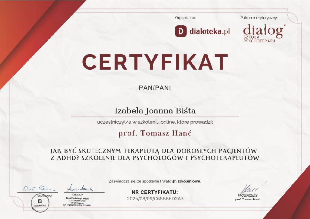 Jestem psycholożką w trakcie 4-letniego szkolenia w nurcie poznawczo-behawioralnym w Szkole Psychoterapii Centrum CBT-EDU. Ukończyłam studia psychologiczne ze specjalnością psychologia kliniczna na Uniwersytecie SWPS. Jestem także członkinią Polskiego Towarzystwa Terapii Poznawczej i Behawioralnej i pracuję pod regularną superwizją.