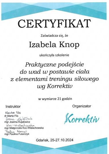Jestem Izabela Knop – magister fizjoterapii z ponad 24-letnim doświadczeniem, absolwentka Akademii Wychowania Fizycznego we Wrocławiu. Specjalizuję się w pracy z dziećmi i młodzieżą, a także w terapii skolioz oraz wad postawy. Moje wieloletnie doświadczenie zdobywałam zarówno w publicznych placówkach medycznych, jak i prowadząc własny gabinet fizjoterapii.