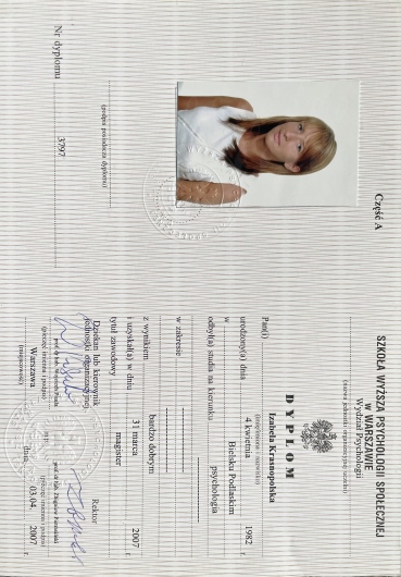 - SWPS w Warszawie: 5 letnie studia magisterskie - kierunek psychologia, specjalność: psychologia społeczna