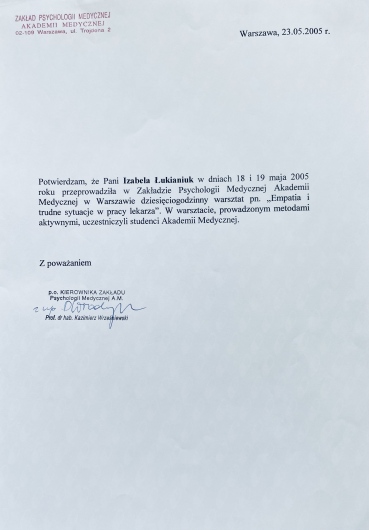 - Zakład Psychologii Medycznej Akademii Medycznej: prowadzenie warsztatów dla studentów Akademii Medycznej w tematyce: „Empatia”