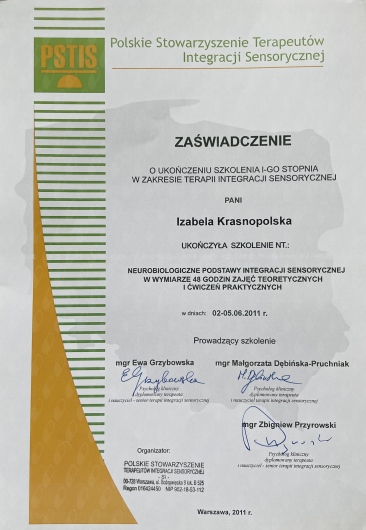 - Polskie Stowarzyszenie Terapeutów Integracji Sensorycznej: roczne szkolenie I-go stopnia w zakresie terapii Integracji Sensorycznej