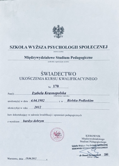 - Szkoła Wyższa Psychologii Społecznej, Międzywydziałowe Studium Pedagogiczne: 2-letni kurs