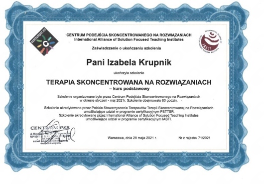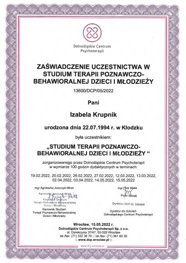 Bardzo dziękuję za tak miłe słowa – to dla mnie ogromna radość i satysfakcja, że mogłam Panią wesprzeć. Cieszę się, że w naszych spotkaniach odnalazła Pani spokój i poczucie bezpieczeństwa, bo właśnie na tym najbardziej mi zależy. Dziękuję za zaufanie i otwartość – to naprawdę dużo znaczy.