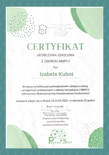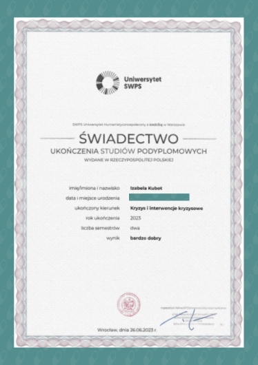 Jestem w trakcie studiów podyplomowych Interwencji Kryzysowej na Uniwersytecie SWPS we Wrocławiu. Ukończyłam również Studium Terapii i Podejścia Skoncentrowanego na Rozwiązaniach - kurs podstawowy TSR w IntegriTSR, pod okiem specjalistów.