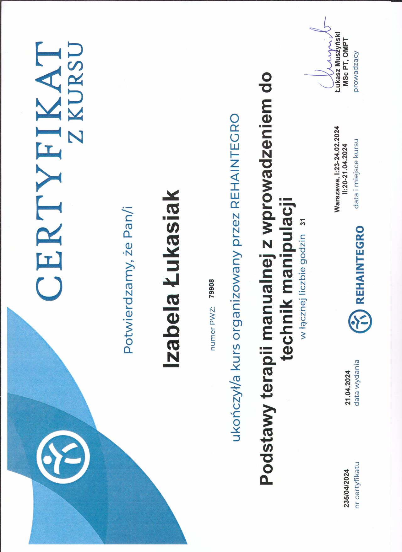 Ukończyłam szkolenia zarówno w zakresie diagnostyki klinicznej, terapii manualnej, jak i ruchowej pracy z pacjentem. Wciąż stawiam na rozwój i zdobywanie nowej wiedzy. Uważam, że sprawne ciało jest istotnym elementem w pokonywaniu każdego dnia z lekkością i w dobrym samopoczuciu.