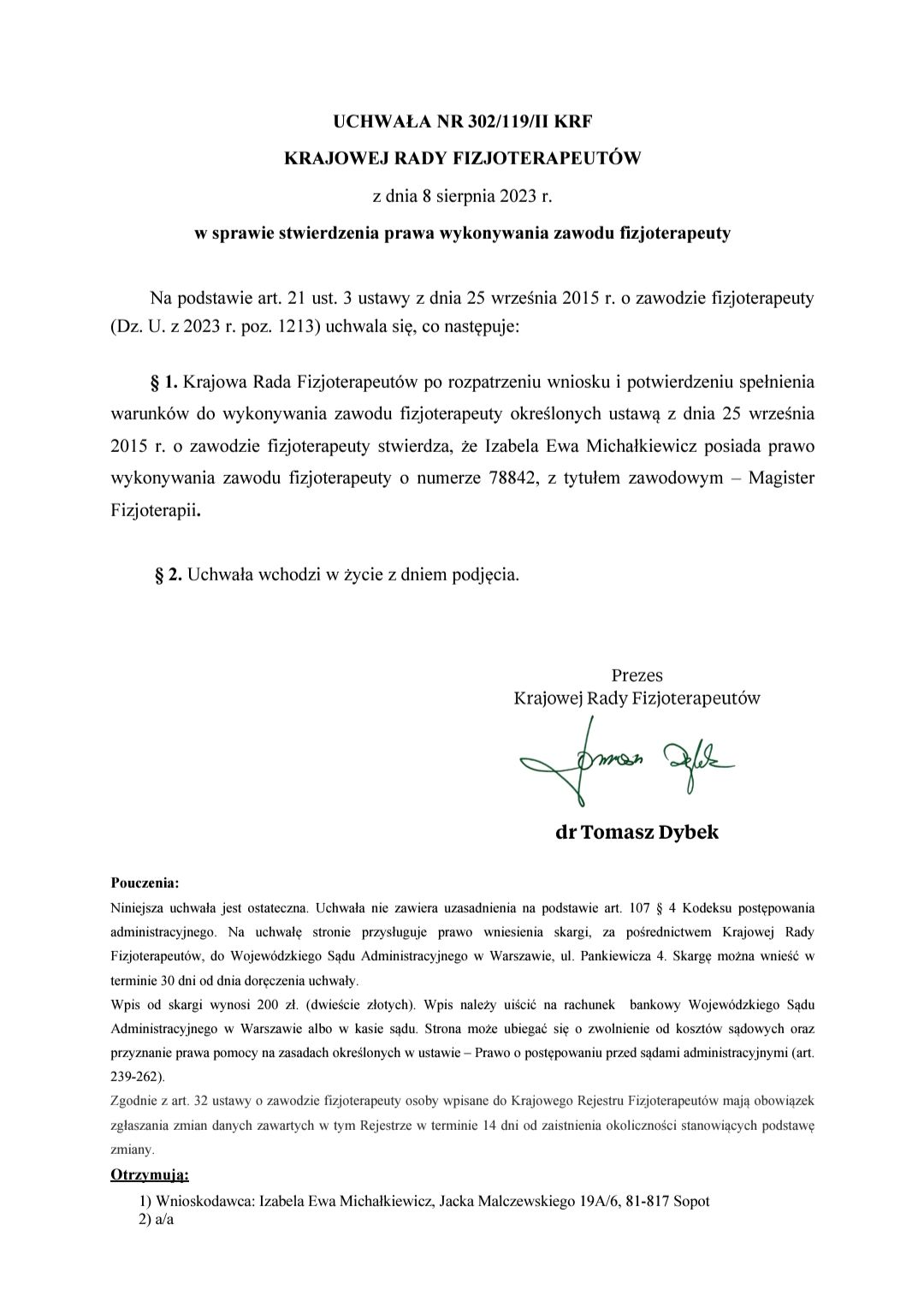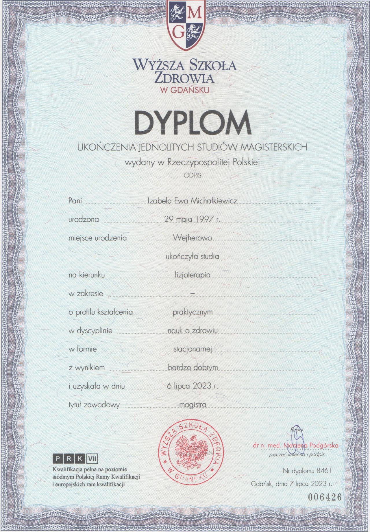 Nazywam sie Izabela M. i jestem Magistrem Fizjoterapii od 2023 roku. Ukończyłam 5-letnie studia magisterskie w Wyższej Szkole Zdrowia w Gdańsku zyskując prawo wykonywania zawodu fizjoterapeuty. Od początku studiów szkolę się i podnoszę swoje kwalifikacje zawodowe, aby "dopasować terapie do pacjenta, a nie pacjenta do terapii".