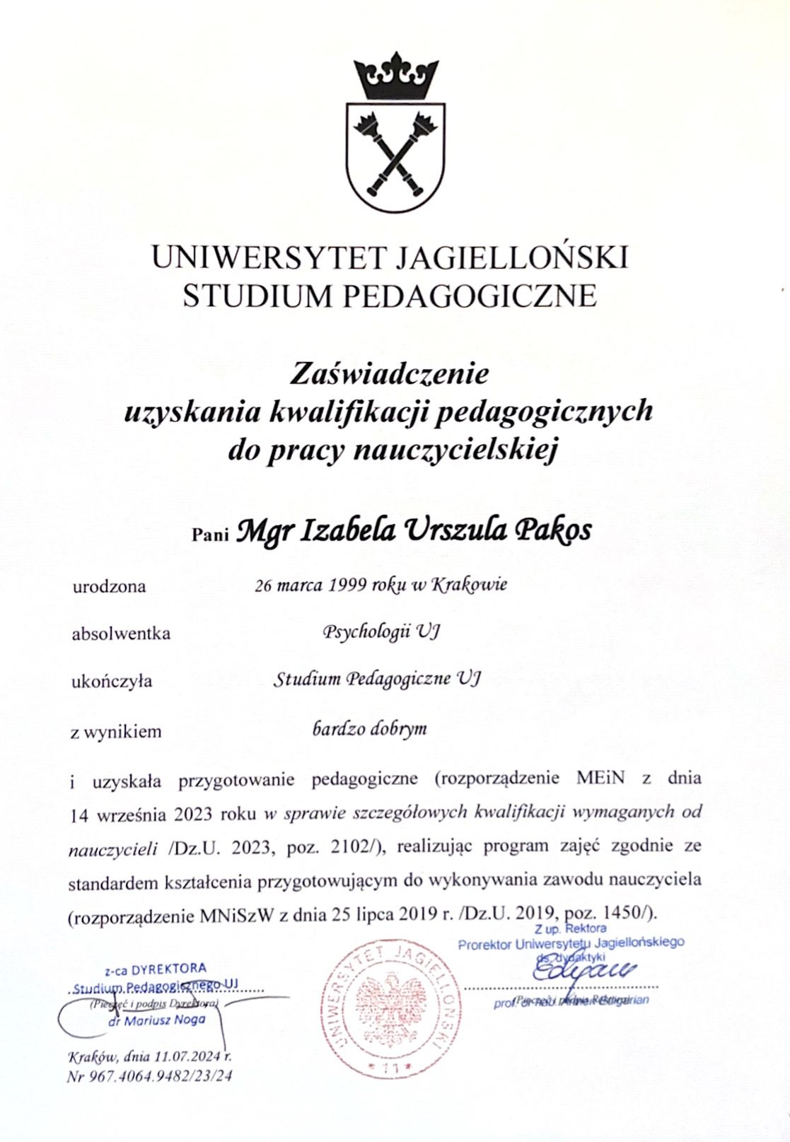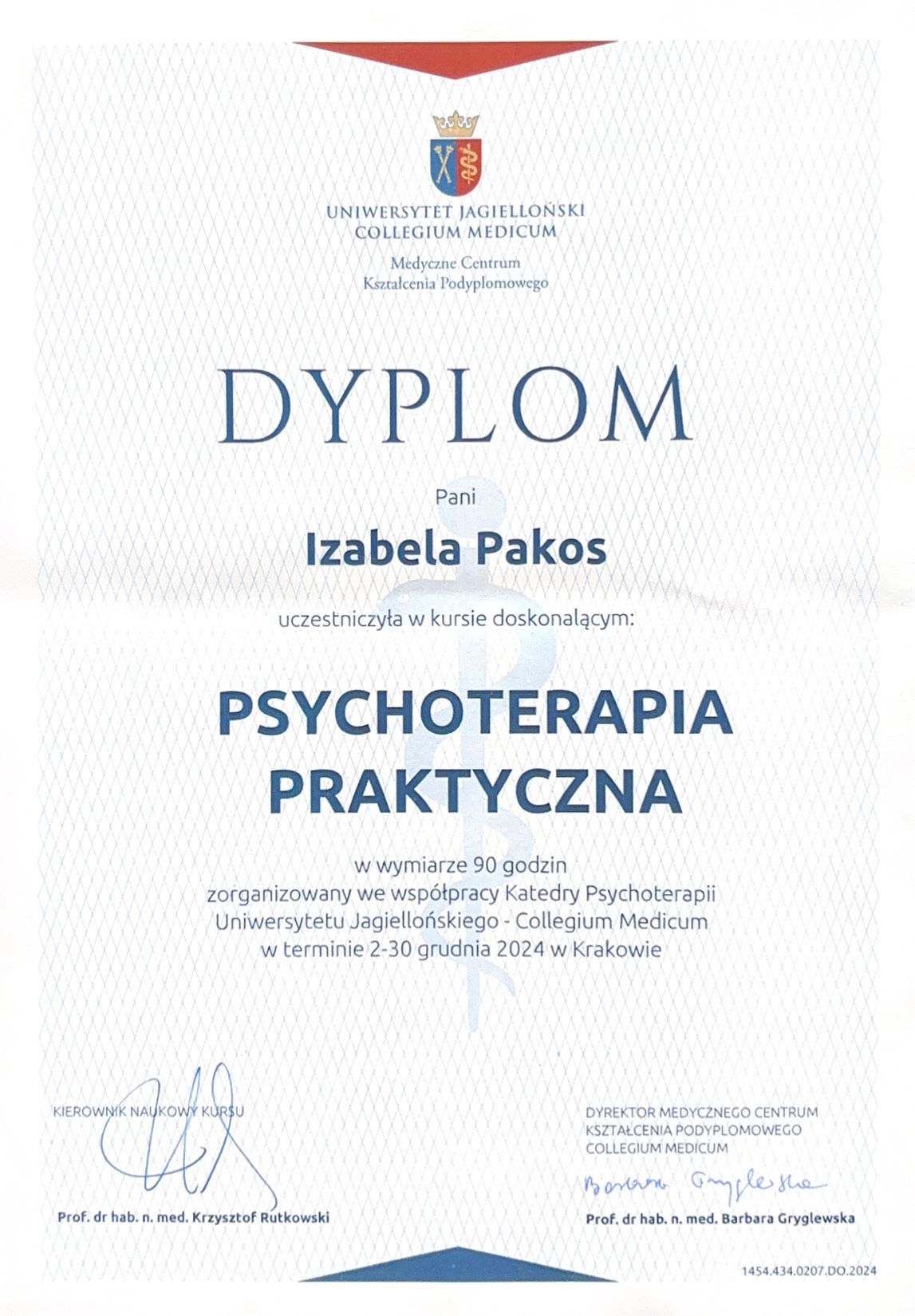 Jestem psychologiem, ukończyłam studia na Uniwersytecie Jagiellońskim. Obecnie jestem w trakcie szkolenia psychoterapeutycznego w nurcie poznawczo-behawioralnym (CBT) w akredytowanym ośrodku Ter-Cognitiva. Ukończyłam kurs podstawowy Terapii Skoncentrowanej na Rozwiązaniach (TSR).
