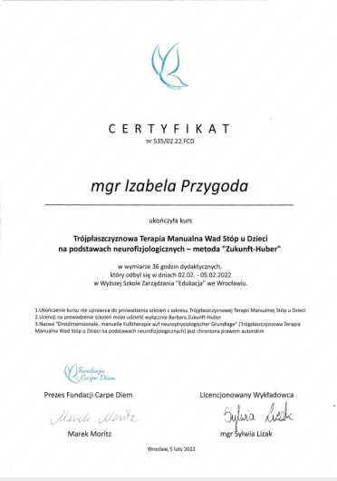 Jaki jest zakres porad oferowanych przez Izabela Przygoda?Izabela Przygoda to fizjoterapeuta, fizjoterapeuta dziecięcy. Na podstawie swojego doświadczenia i wykształcenia Izabela Przygoda oferuje usługi takie jak: terapia integracji sensorycznej, terapia wad postawy, terapia ręki, Diagnoza zaburzeń integracji sensorycznej z opinią, badanie wad postawy, trójpłaszczyznowa terapia manualna wad stóp u dzieci, Fizjoterapia dzieci (kolejna wizyta), masaż relaksacyjny, Konsultacja ws. procesów Integracji Sensorycznej, Terapia Integracji Sensorycznej.