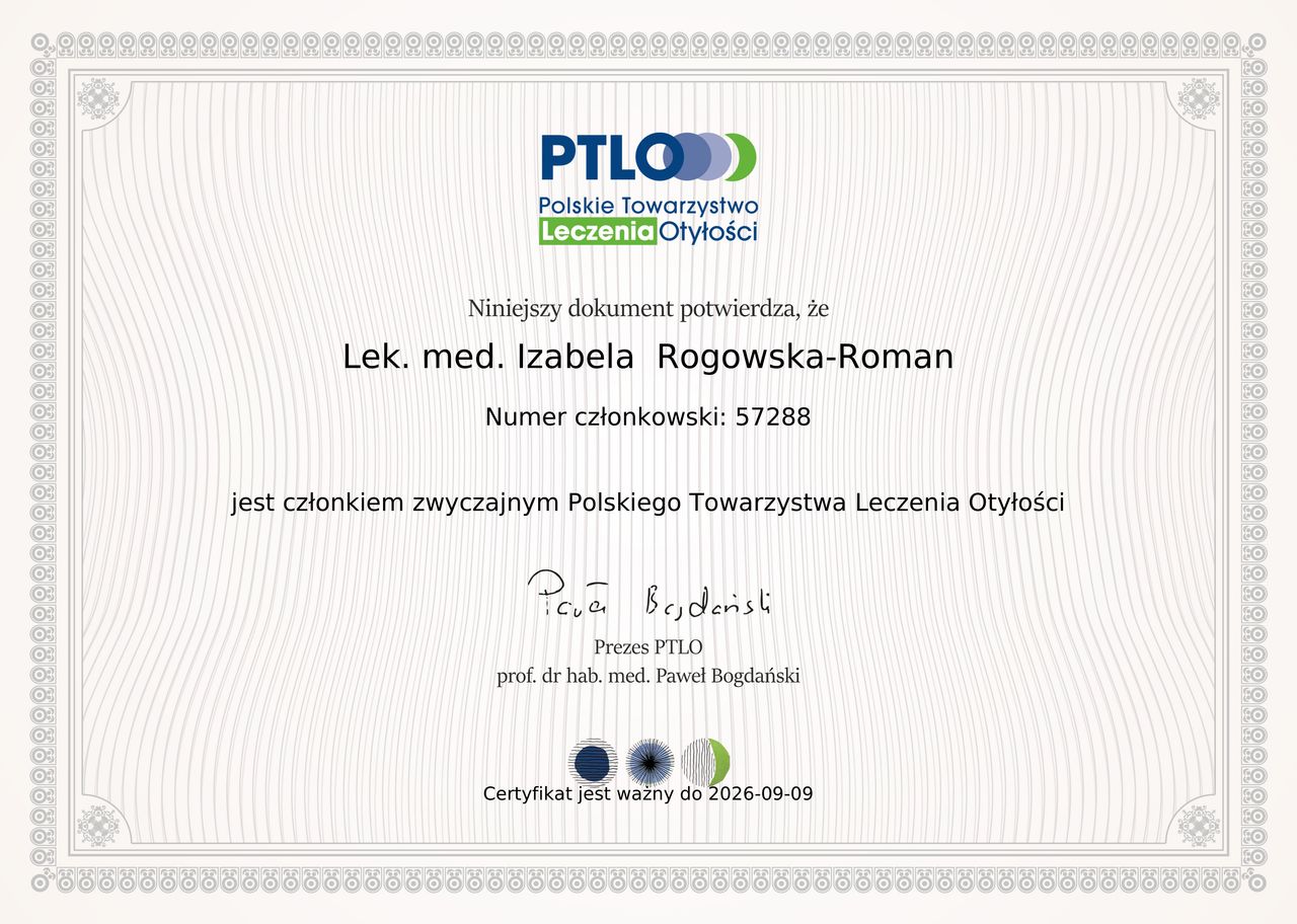 Jestem członkiem Towarzystwa Internistów Polskich, Towarzystwa Lekarzy Rodzinnych i Polskiego Towarzystwa Leczenia Otyłości. Regularnie uczestniczę w konferencjach i szkoleniach. W pracy kieruję się empatią i stawiam na partnerską współpracę z pacjentem, aby wspólnie wypracować skuteczny plan leczenia.