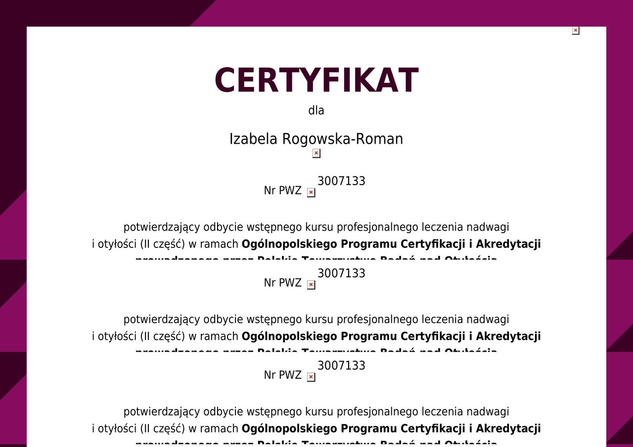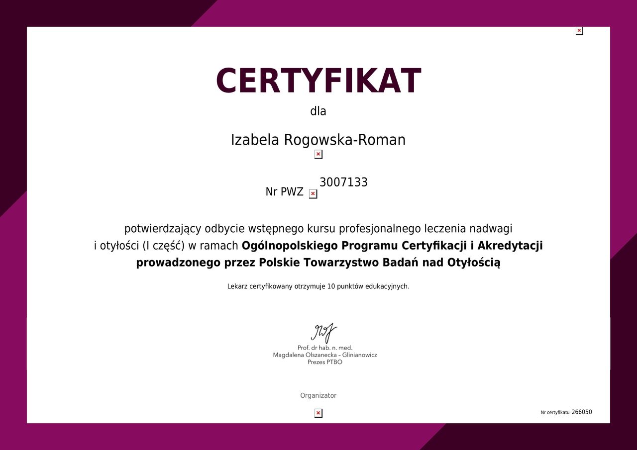 Jaki jest zakres porad oferowanych przez Izabela Rogowska-Roman ?Izabela Rogowska-Roman to internista. Na podstawie swojego doświadczenia i wykształcenia Izabela Rogowska-Roman oferuje usługi takie jak: Konsultacja obesitologiczna (leczenie otyłości), konsultacja internistyczna.
