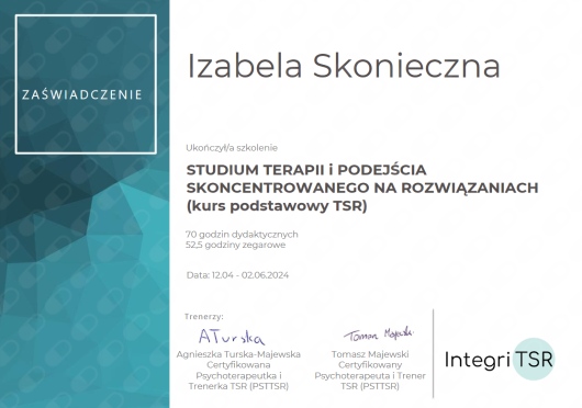 - Integri TSR - I stopień Terapii Skoncentrowanej na Rozwiązaniach