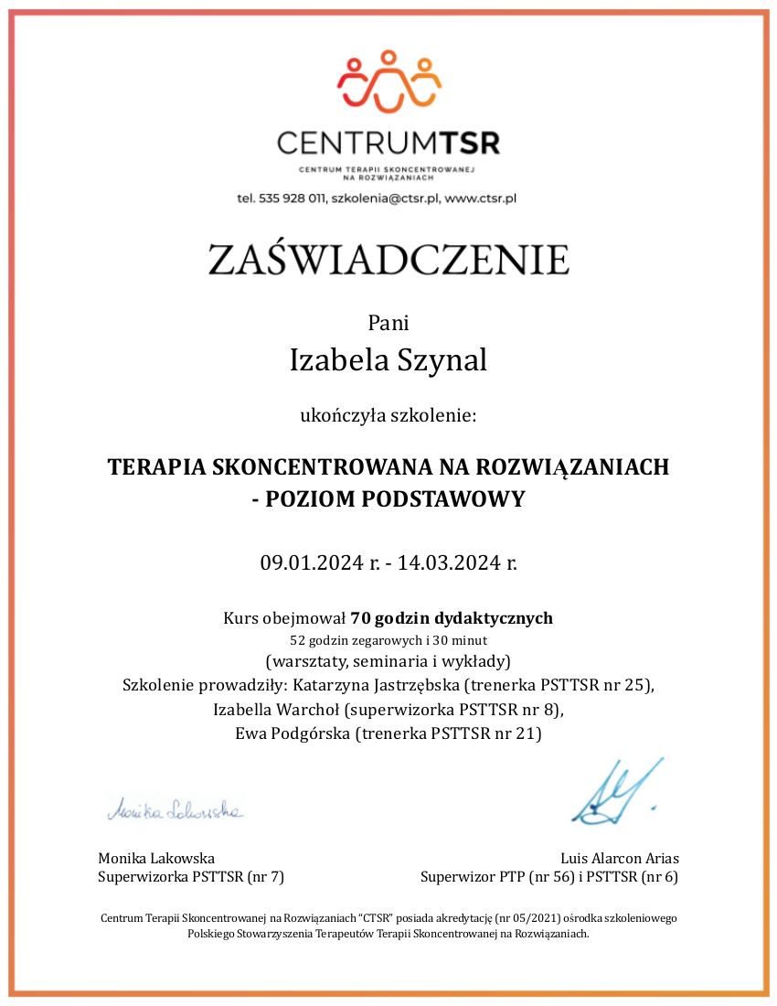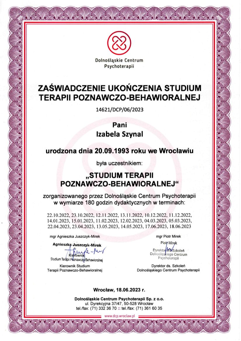 Ukończyłam psychologię na Uniwersytecie SWPS we Wrocławiu oraz dietetykę na Uniwersytecie Medycznym we Wrocławiu. Obecnie jestem w trakcie czteroletniej szkoly psychoterapii poznawczo-behawioralnej Instytut Poznawczy. Jestem członkiem Polskiego Towarzystwa Terapii Poznawczej i Behawioralnej. Brałam udział w Studium Terapii Poznawczo - Behawioralnej prowadzonym przez Dolnośląskie Centrum Psychoterapii. Ukończyłam również roczne studium Terapii Skoncentrowanej na Rozwiązaniach. Stale poszerzam swoją wiedzę uczestnicząc w konferencjach i szkoleniach. Swoją pracę poddaję regularnej superwizji.