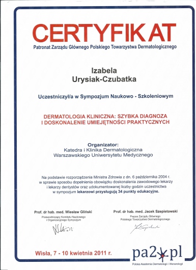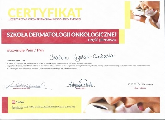 * Specjalizacja II stopnia w dziedzinie dermatologii i wenerologii uzyskana w 2012 roku.