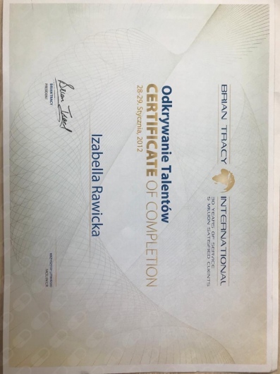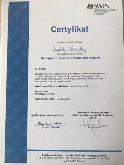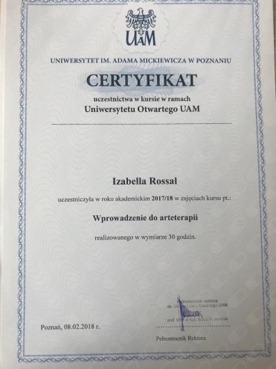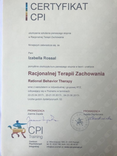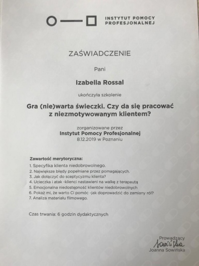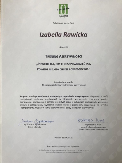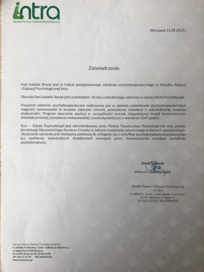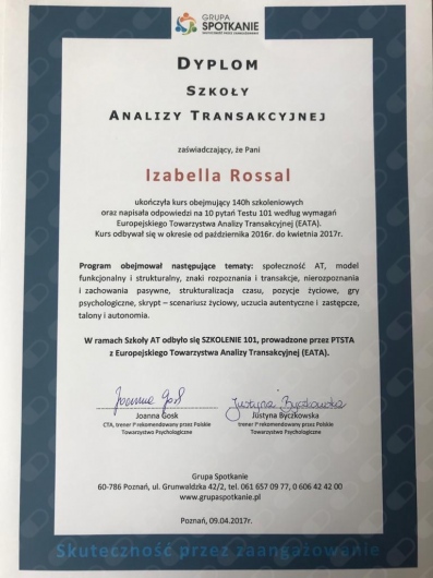 Swoją wiedzę i umiejętności stale poszerzam poprzez udział w szkoleniach i konferencjach. Aktualnie jestem w trakcie 4-letniego szkolenia psychoterapeutycznego w Szkole Psychoterapii Ośrodka Edukacji i Pomocy Psychologicznej INTRA w Warszawie (szkoła akredytowana przez Polskie Towarzystwo Psychologiczne). Ukończyłam również roczną Szkoły Analizy Transakcyjnej wraz z certyfikowanym Szkoleniem 101, kurs Racjonalnej Terapii Zachowania – RTZ (w nurcie terapii poznawczo-behawioralnej) oraz kurs Terapii Skoncentrowanej na Rozwiązaniach, nadto liczne szkolenia związane z problematyką psychoterapii i pomocy psychologicznej oraz rozwoju osobistego, a także warsztaty z technik oddechowych i relaksacyjnych oraz pracy z ciałem (TRE, ćwiczenia bioenergetyczne wg A. Lowena), kursy redukcji stresu oparte na uważności MBSR/Mindfulness oraz MBB (Mind-Body Bridging) i MBCL.