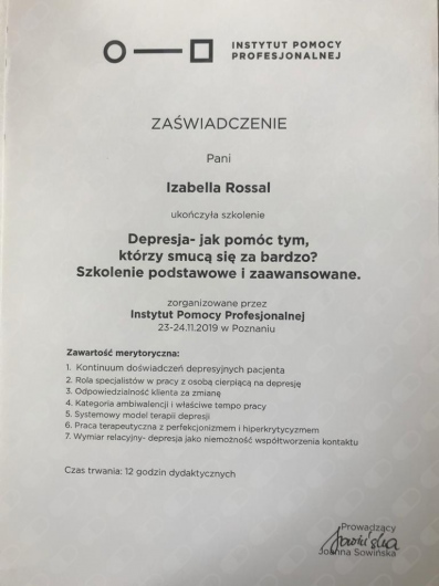 Pani Izabela to prawdziwa profesjonalistka. Od pierwszej wizyty umie stworzyć atmosferę bezpieczeństwa i zaufania. Nie ocenia, nie osądza, nie doradza ani nie sugeruje rozwiązań. Potrafi pomóc w zrozumieniu motywacji pacjenta i nakierować myślenie na właściwe tory. Z czystym sumieniem bardzo polecam.