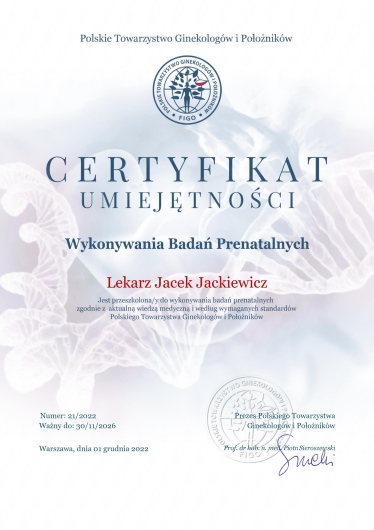 Bardzo cieszymy się z mężem, że trafiliśmy na Pana Doktora. Robiliśmy u niego wszystkie badania prenatalne. Jakbyśmy mieli drugi raz wybierać lekarza to znów nasz wybór padłby na Doktora Jackiewicza. Każde badanie było wykonane szczegółowo. Doktor jest bardzo uprzejmy a dodatkowo ma świetne poczucie humoru. Za każdym razem czekaliśmy z niecierpliwością na wizytę u Pana Doktora, dużo robi zdjęć, wszystko opisuje i mówi co bada w danym momencie. Jest spokojny, dokładny. Zawsze wychodziliśmy z uśmiechami na twarzach. Doktor godny polecenia!