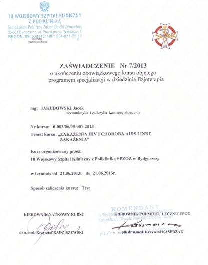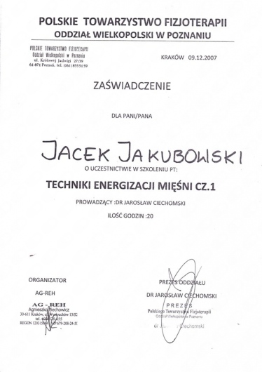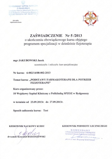 Następnie ukończyłem Studia Specjalizacyjne z dziedziny fizjoterapii w Centrum Medycznym Kształcenia Podyplomowego w Warszawie z tytułem specjalista fizjoterapii,