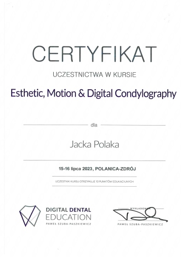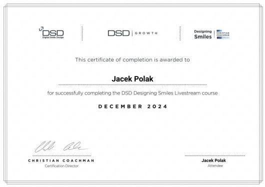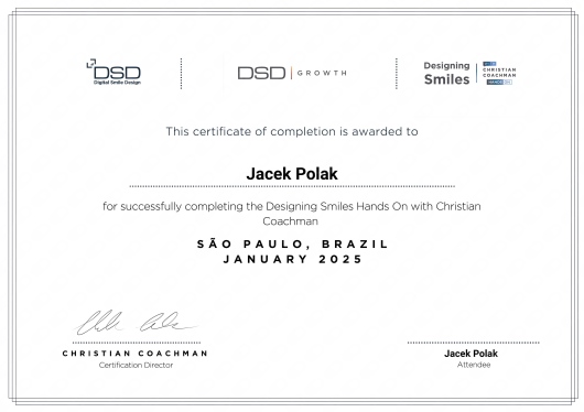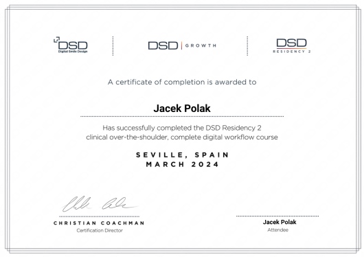 Nieustannie podnoszę swoje kwalifikacje, uczestnicząc w krajowych i międzynarodowych szkoleniach. Moje doświadczenie obejmuje wszystkie obszary stomatologii, co pozwoliło mi wypracować holistyczne podejście do leczenia. W ostatnich latach skoncentrowałem się na nowoczesnych procedurach protetycznych i implantologicznych, szczególnie w zakresie kompleksowych terapii uśmiechu, które wykorzystują cyfrowe metody diagnostyczne. Dzięki zaawansowanym narzędziom, takim jak tomograf cyfrowy, skaner wewnątrzustny i drukarki 3D, współpracuję z międzynarodowymi ekspertami, w tym z DSD Planning Center w Madrycie.