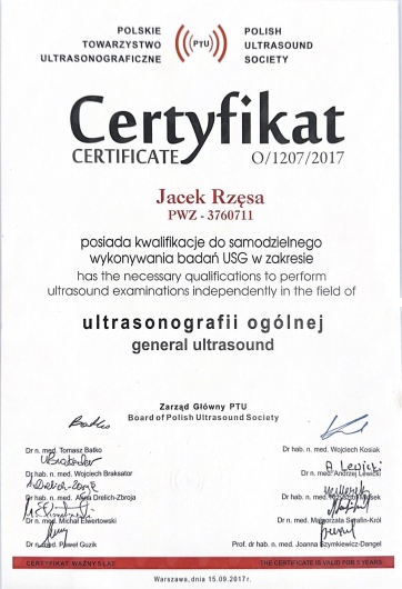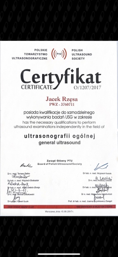 Jestem specjalistą chorób wewnętrznych.Ukończyłem wydział lekarski Uniwersytetu Medycznego we Wrocławiu. Przez wiele lat pracowałem w oddziale chorób wewnętrznych, gdzie zajmowałem się chorobami przewodu pokarmowego, płuc,wątroby ,układu krążenia,metabolicznymi w tym cukrzycą, chorobami z zakresu endokrynologii, w tym tarczycy.Uzyskałem certyfikat Polskiego Towarzystwa Ultrasonografii uprawniający do wykonywania badań w zakresie ultrasonografii ogólnej.Wykonuję badania USG jamy brzusznej, tarczycy, węzłów chłonnych,szyi,ślinianek.Jestem członkiem Polskiego Towarzystwa Ultrasonografii.Uczestniczyłem i uczestniczę w wielu szkoleniach doskonalących moją wiedzę i umiejętności organizowanych przez Roztoczańską Szkołę Ultrasonografii,CEDUS-centrum edukacji,Akademię Siemens Healthare,Eduson,USG Trener,Wielkoposką Szkołę Ultrasonografii.