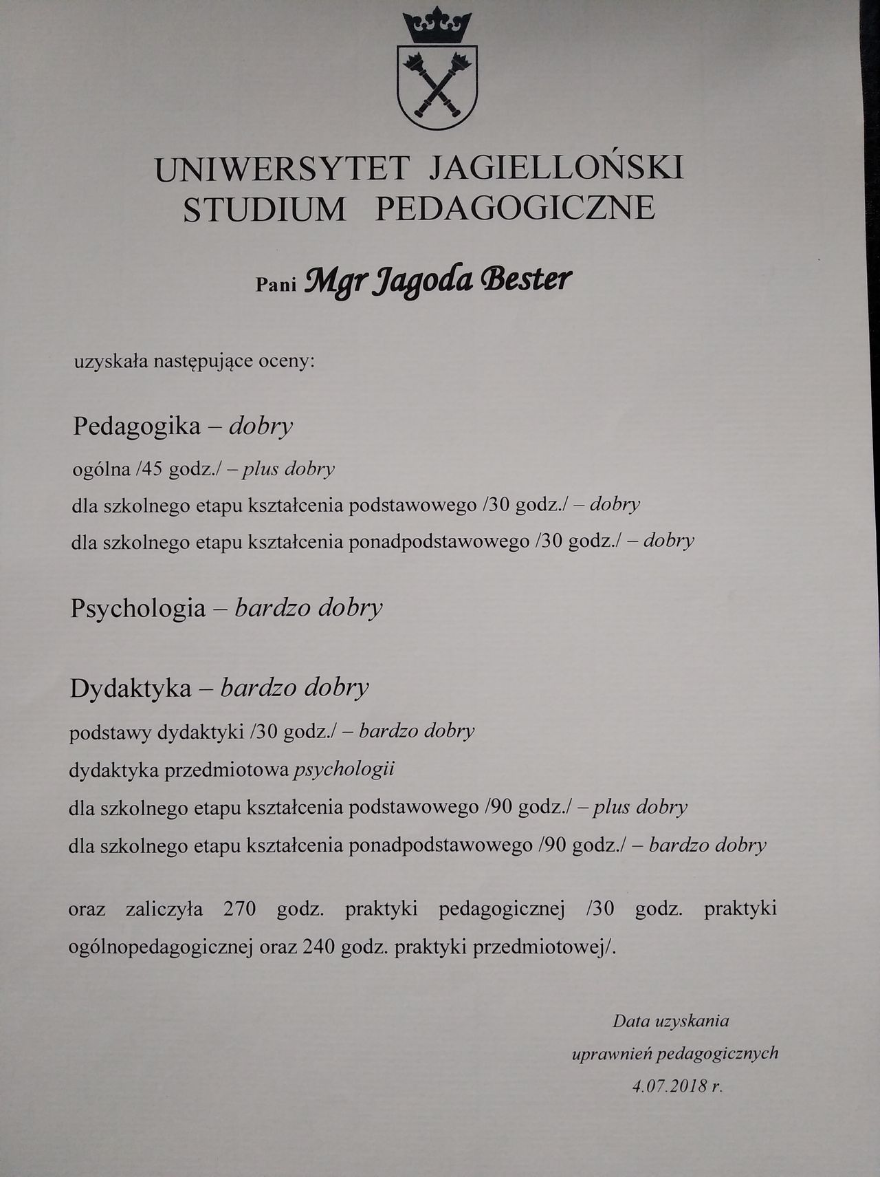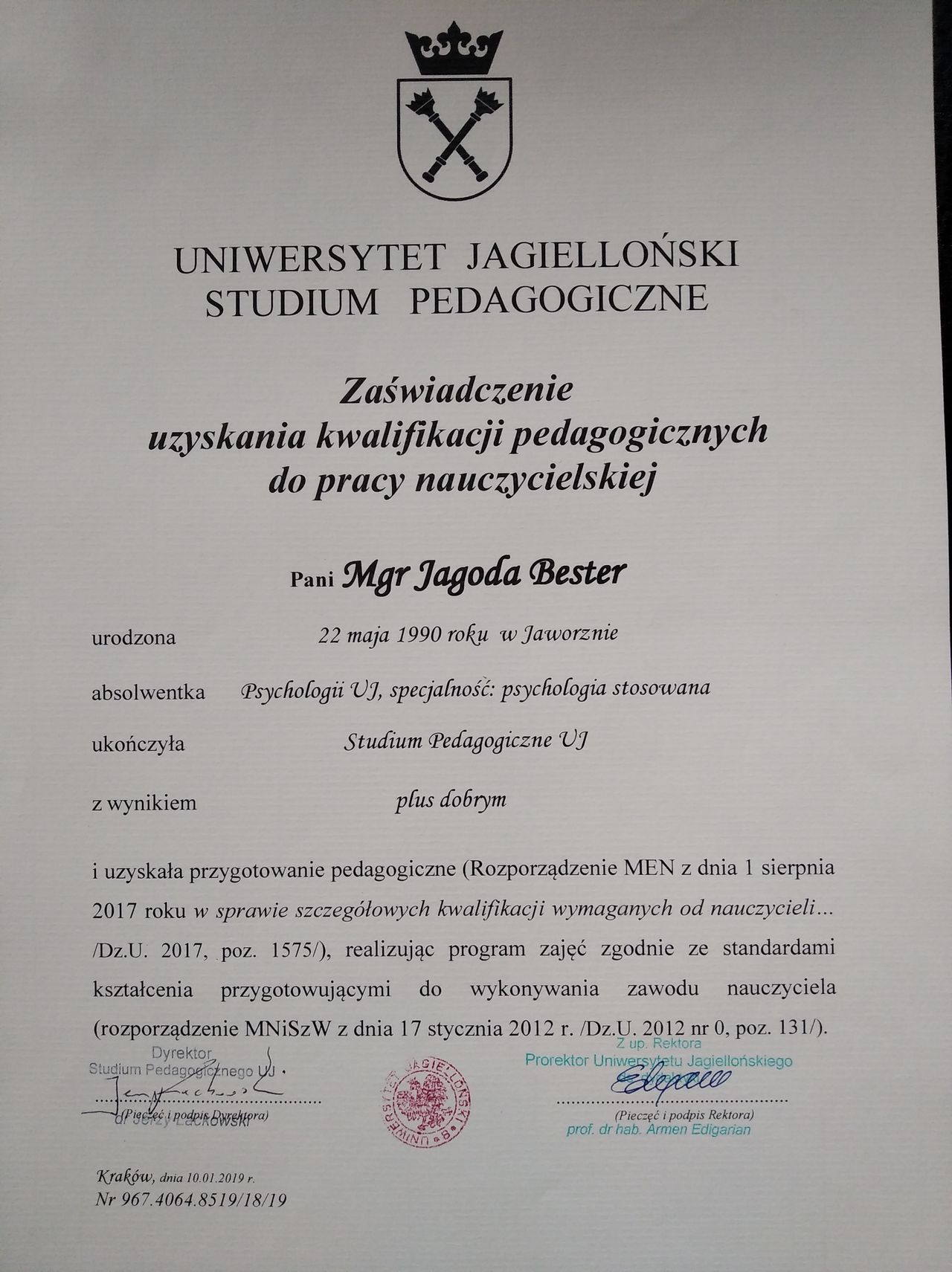 Z całego serca polecam Panią Jagodę. Nie dawno zakończyłam swoją psychoterapię i nigdy nie byłam tak zadowolona z usług psychologa. Pani Jagoda jest bardzo uważną, kompetntną i cierpliwą specjalistką. Przy rozmowach zawsze czułam sie wysłuchana, a Pani Jagoda za każdym razem pomagała mi zrozumieć daną sprawe. Serdecznie Polecam!