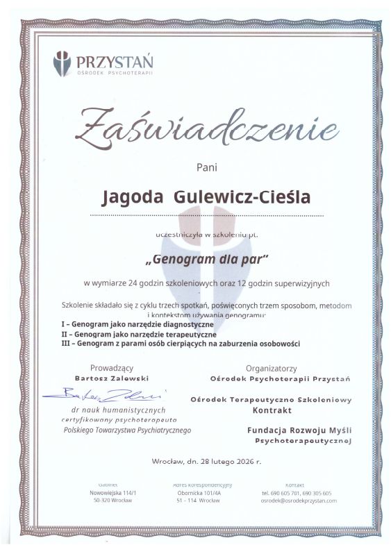 Jestem dyplomowanym psychologiem, absolwentką 5-letnich studiów psychologicznych na Uniwersytecie SWPS we Wrocławiu oraz psychoterapeutką w trakcie szkolenia we Wrocławskim Instytucie Psychoterapii akredytowanym przez Polskie Towarzystwo Psychiatryczne i Psychologiczne. Ze swoim doświadczeniem pomocy psychologicznej startowałam w Centrum Praw Kobiet, gdzie wspierałam i towarzyszyłam kobietom, które doświadczyły przemocy domowej. Uczestniczyłam również na stażach, gdzie nabywałam umiejętności prowadzenia psychoterapii par i rodzin (Gdańskie Centrum Zdrowia Oddział Dzienny Psychiatryczny Dzieci i Młodzieży, Zakład Terapii Rodzin w Krakowie).
