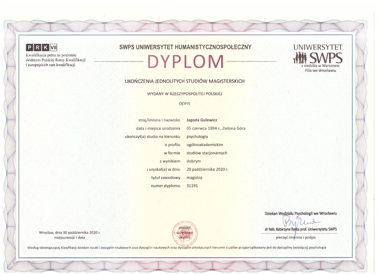 Jestem dyplomowanym psychologiem, absolwentką 5-letnich studiów psychologicznych na Uniwersytecie SWPS we Wrocławiu oraz psychoterapeutką w trakcie szkolenia we Wrocławskim Instytucie Psychoterapii akredytowanym przez Polskie Towarzystwo Psychiatryczne i Psychologiczne. Ukończyłam Studium Przeciwdziałania Przemocy Domowej I-go stopnia prowadzone przez Niebieską Linię. Posiadam również pomniejsze szkolenia dotyczące tematów takich jak: interwencja kryzysowa, pomoc w rodzinie z problemem uzależnienia, wsparcie dziecka w sytuacji przemocy domowej. Swoje doświadczenie głównie zdobywałam w Centrum Praw Kobiet, gdzie wspierałam i towarzyszyłam kobietom, które doświadczyły przemocy domowej oraz na stażach, gdzie uczyłam się terapii par i rodzin (Gdańskie Centrum Zdrowia Oddział Dzienny Psychiatryczny Dzieci i Młodzieży, Zakład Terapii Rodzin w Krakowie).