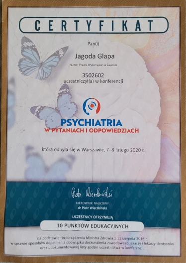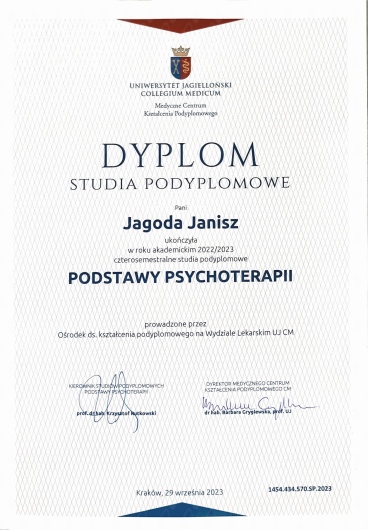 Obecnie jestem w trakcie 4-letniego szkolenia z zakresu psychoterapii prowadzonego przez Uniwersytet Jagielloński w Krakowie, akredytowanego przez Polskie Towarzystwo Psychiatryczne.