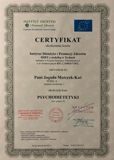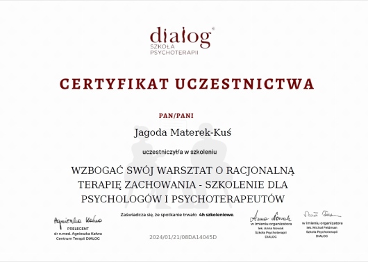 Jestem absolwentką studiów magisterskich na kierunku psychologia na Uniwersytecie Opolskim. Ponadto ukończyłam kursy i szkolenia m.in. z zakresu: Terapii Skoncentrowanej na Rozwiązaniach, Interwencji Kryzysowej i Psychodietetyki.