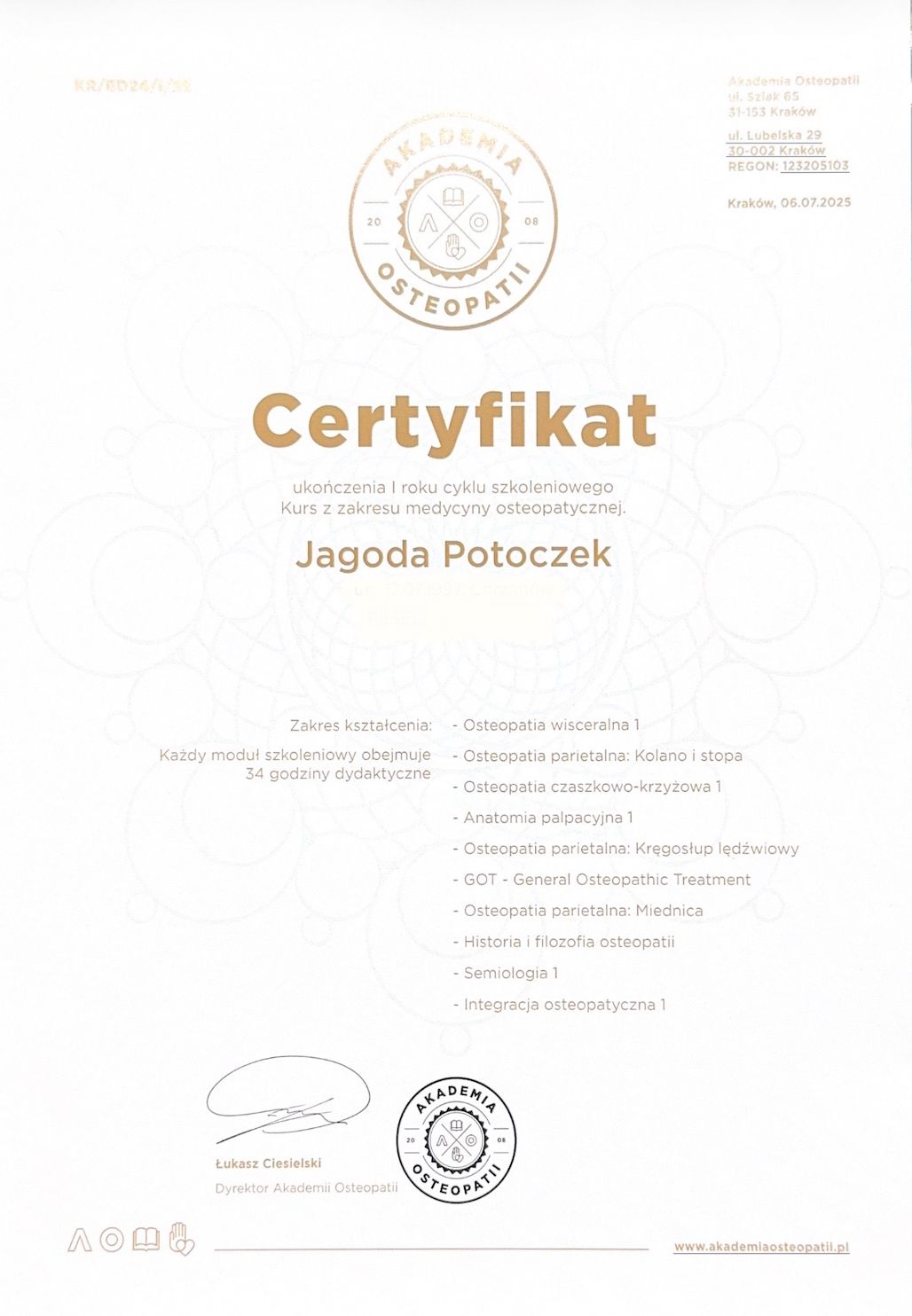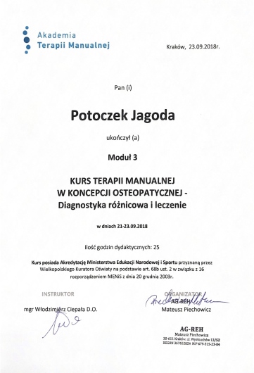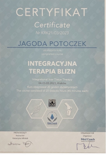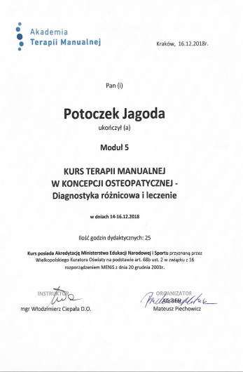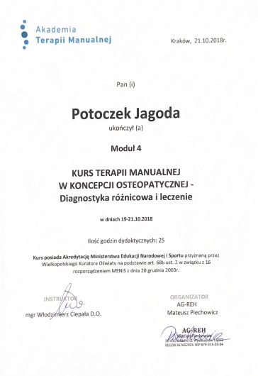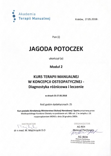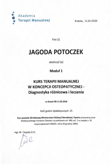 Ukończyłam studia fizjoterapii na Collegium Medicum Uniwersytetu Jagiellońskiego oraz Akademii Wychowania Fizycznego we Wrocławiu. Obecnie kontynuuję 4,5 letnie kształcenie podyplomowe w zakresie osteopatii w Akademii Osteopatii.