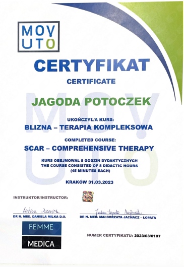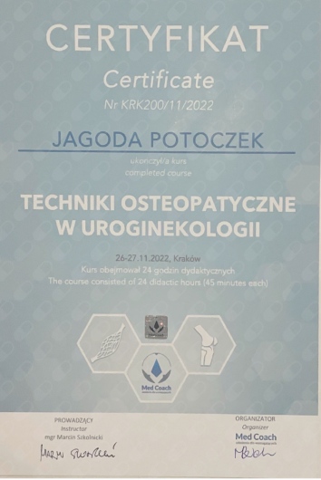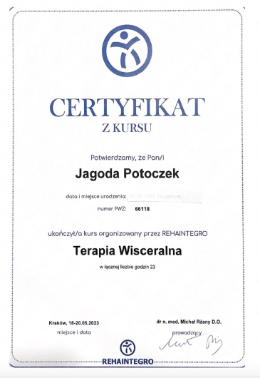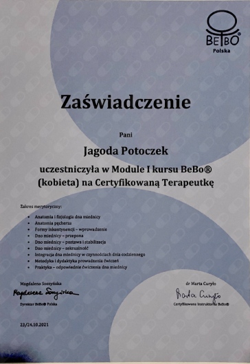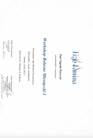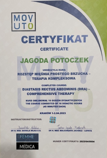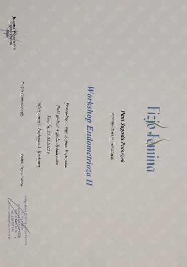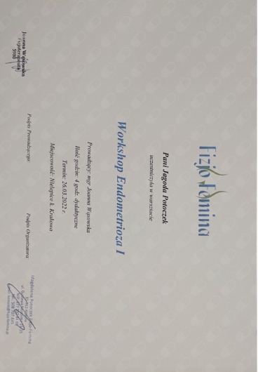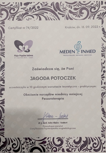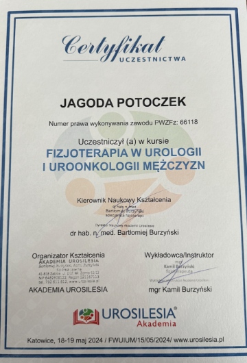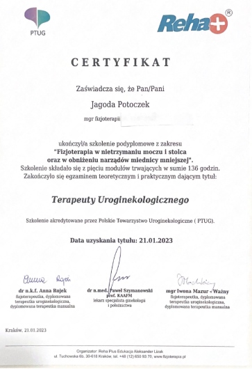 Jestem certyfikowaną fizjoterapeutką uroginekologiczną Polskiego Towarzystwa Uroginekologicznego (PTUG).