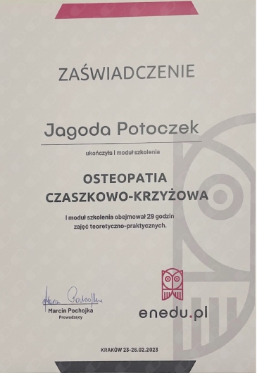 Pani Jagoda Potoczek to świetna specjalistka – profesjonalna, bardzo kompetentna, empatyczna i zaangażowana. Dzięki jej pomocy moje dolegliwości znacznie się zmniejszyły, a każda wizyta przebiega w przyjaznej atmosferze. Z całego serca polecam!