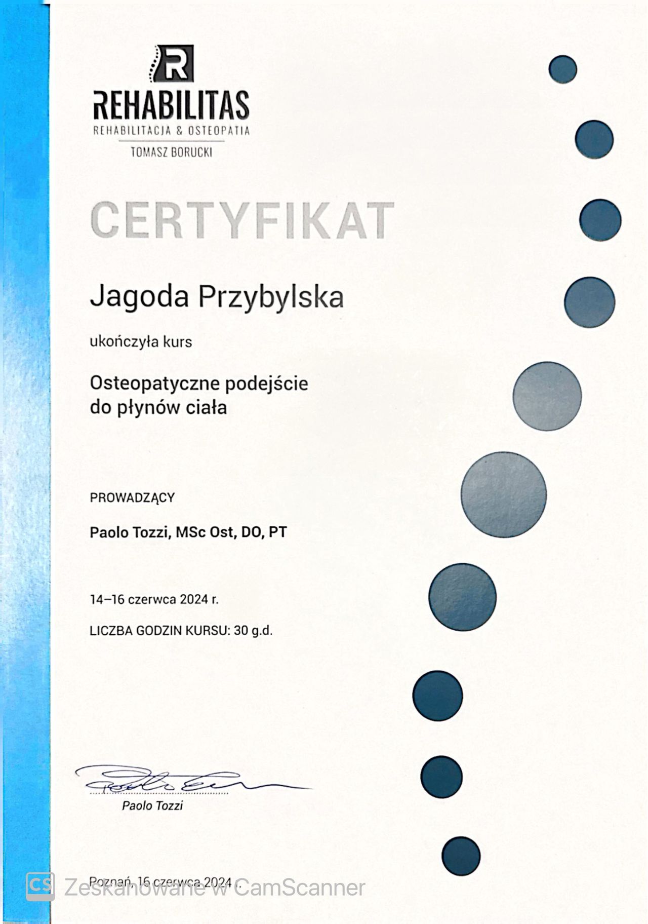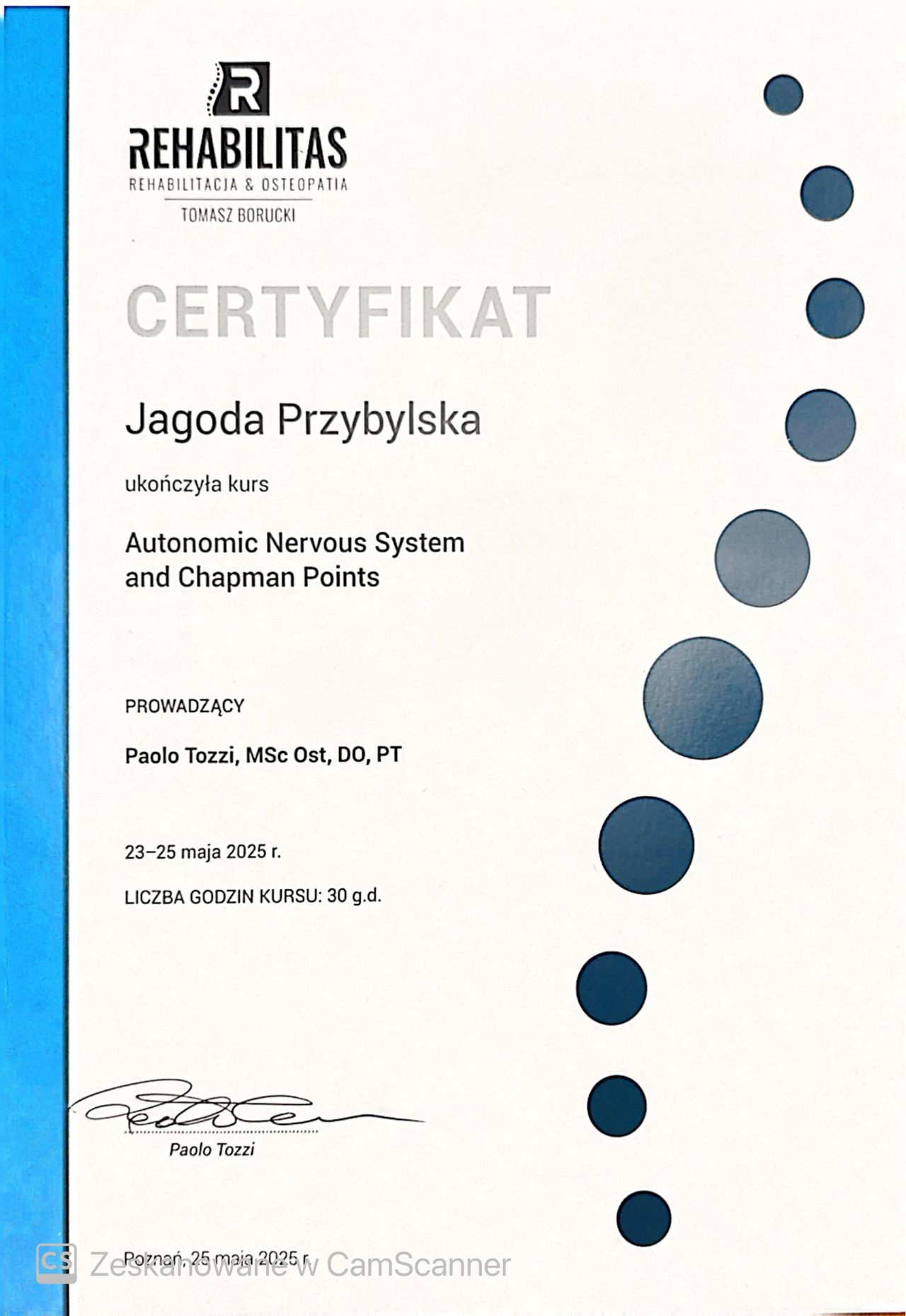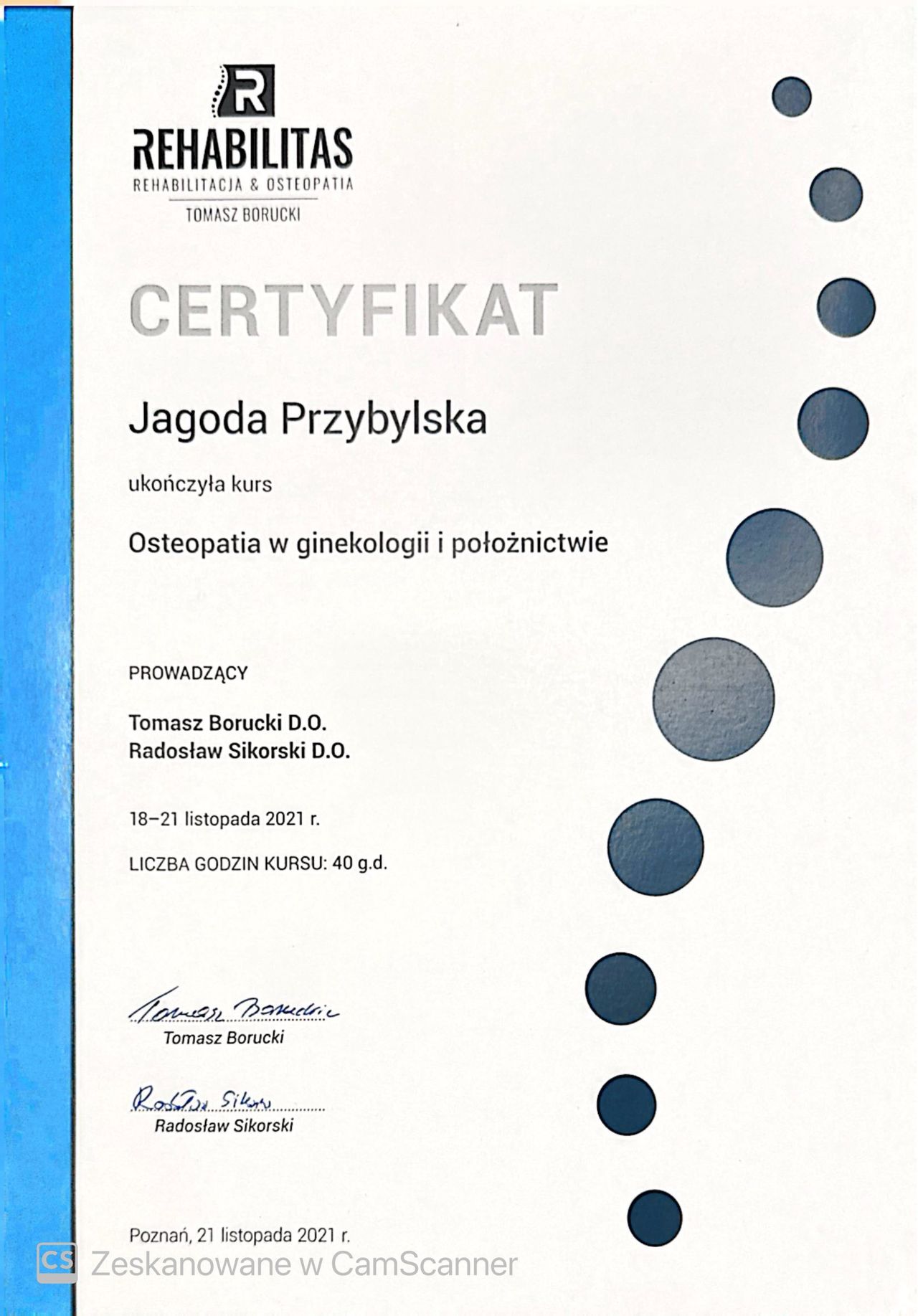 Jestem absolwentką Akademii Wychowania Fizycznego w Poznaniu na kierunku fizjoterapia oraz Osteopathie Schule Deutschland na kierunku osteopatia.