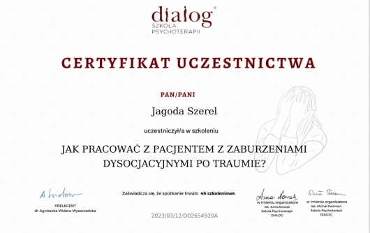 Czy Jagoda Szerel przyjmuje online, bez konieczności pojawiania się w placówce?Tak, Jagoda Szerel oferuje konsultacje online. Wybierz opcję „konsultacja online” przy umawianiu wizyty, a zobaczysz dostępne terminy.