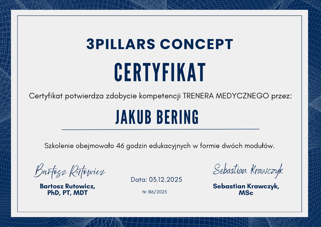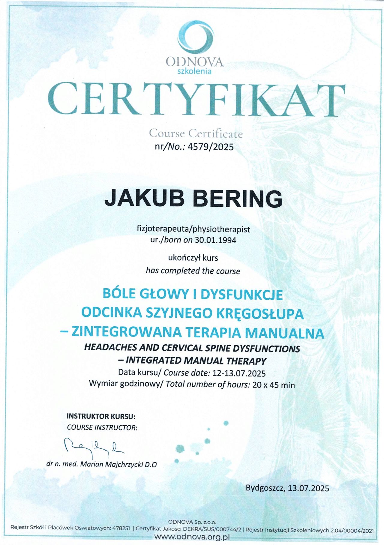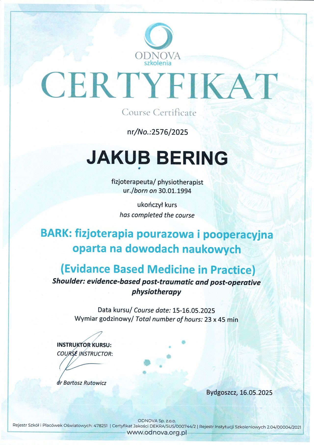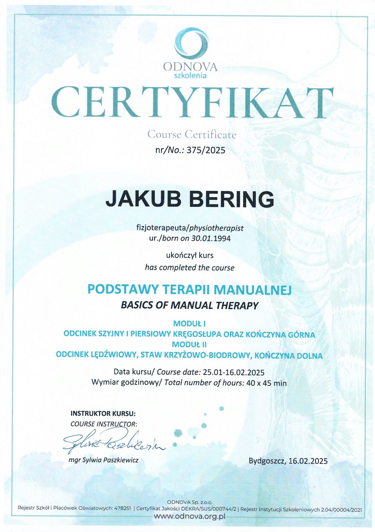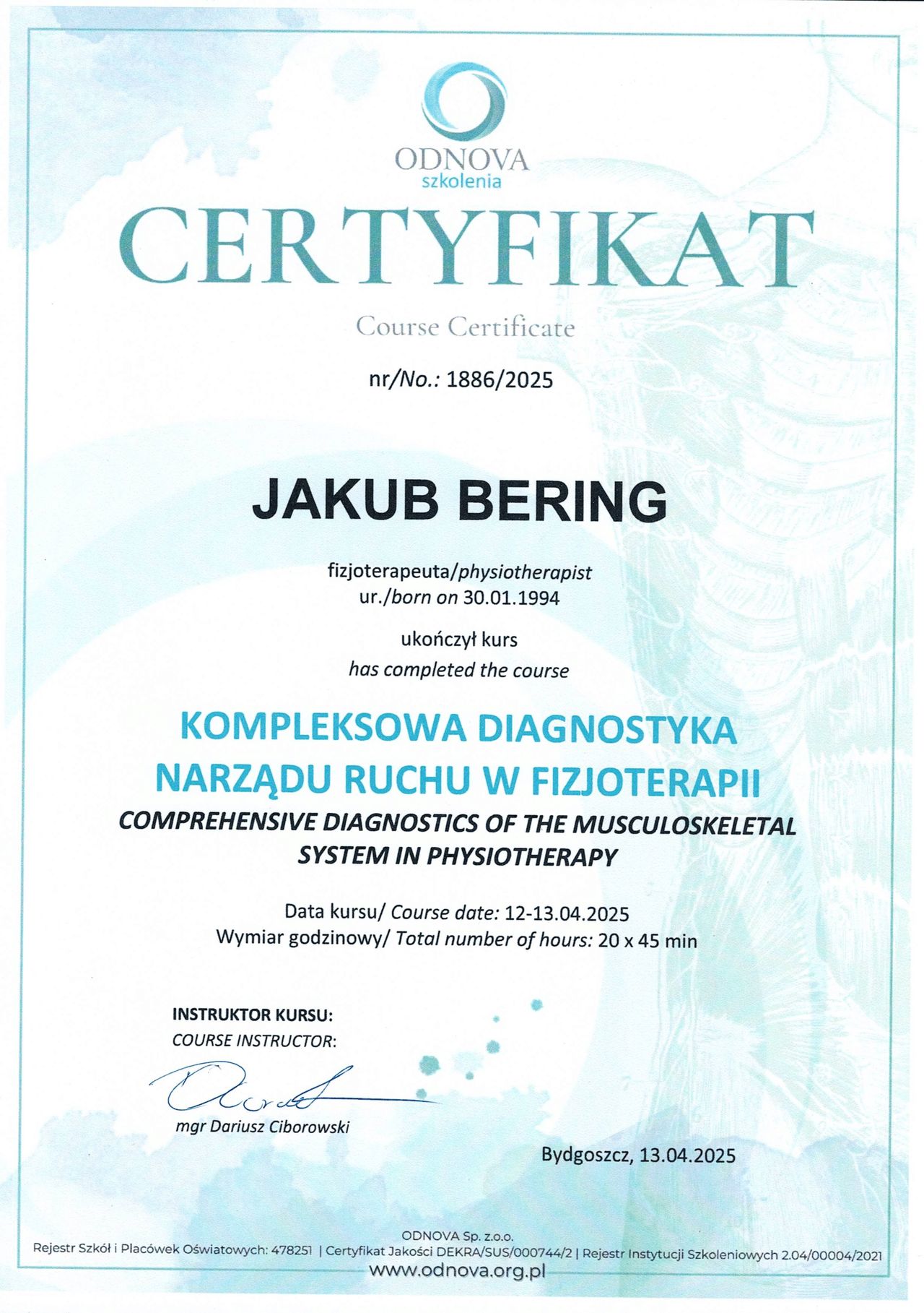 Jaki jest zakres porad oferowanych przez Jakub Bering?Jakub Bering to fizjoterapeuta. Na podstawie swojego doświadczenia i wykształcenia Jakub Bering oferuje usługi takie jak: konsultacja fizjoterapeutyczna (pierwsza wizyta), konsultacja fizjoterapeutyczna (kolejna wizyta).