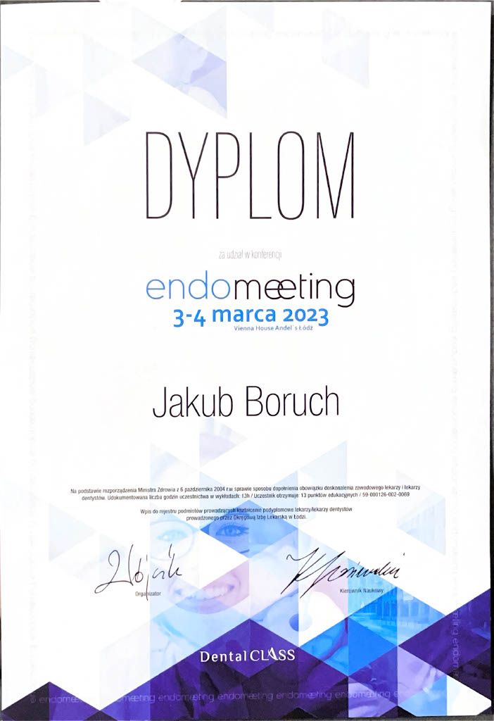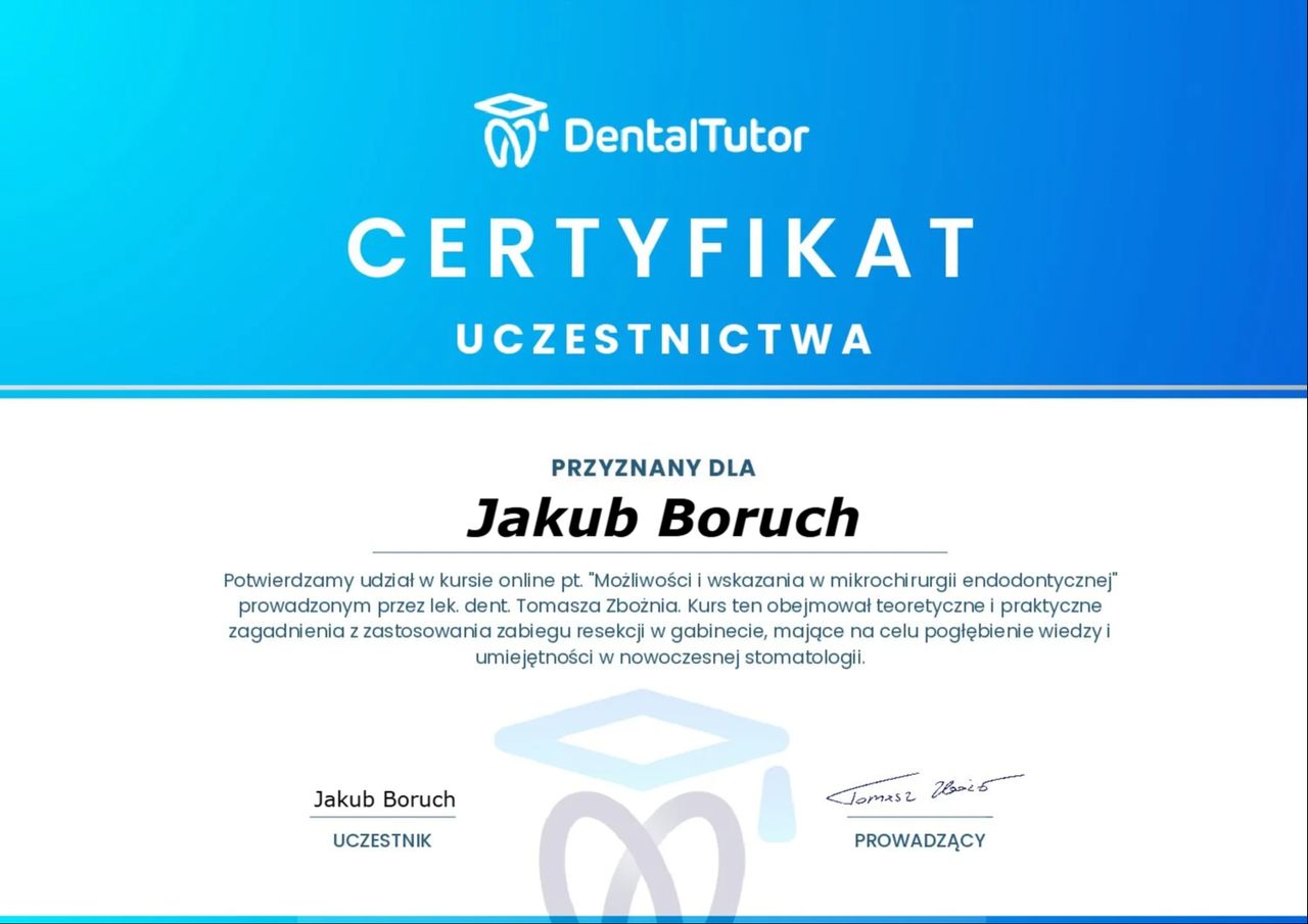 Jaki jest zakres porad oferowanych przez Jakub Boruch?Jakub Boruch to stomatolog. Na podstawie swojego doświadczenia i wykształcenia Jakub Boruch oferuje usługi takie jak: Konsultacja stomatologiczna, konsultacja endodontyczna, leczenie kanałowe pod mikroskopem.