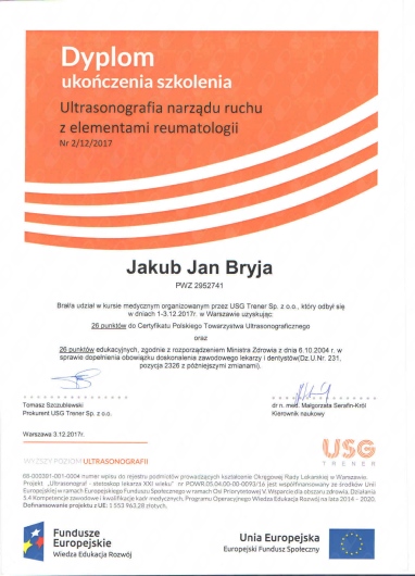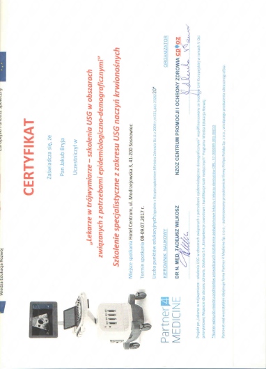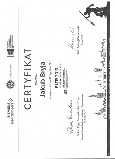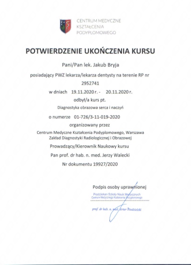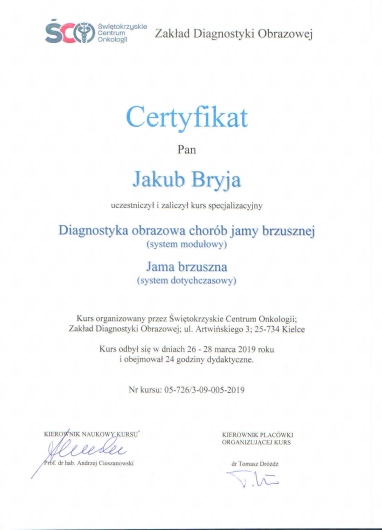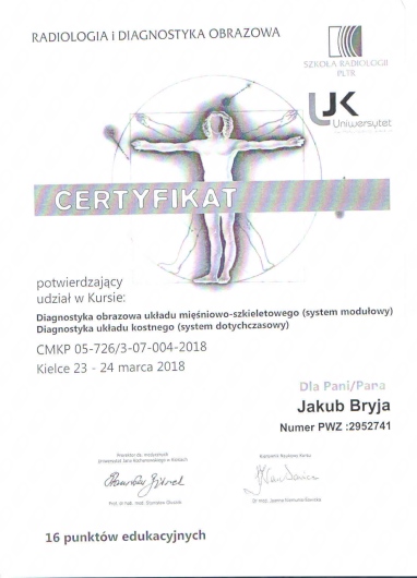 Stale podnoszę swoje kwalifikacje poprzez udział w kursach i szkoleniach, jestem członkiem Towarzystw Radiologicznych polskich i zagranicznych ( PLTR – Polskiego Lekarskiego Towarzystwa Radiologicznego, ESR – European Society of Radiology, RSNA – Radiological Society of Radiology )
