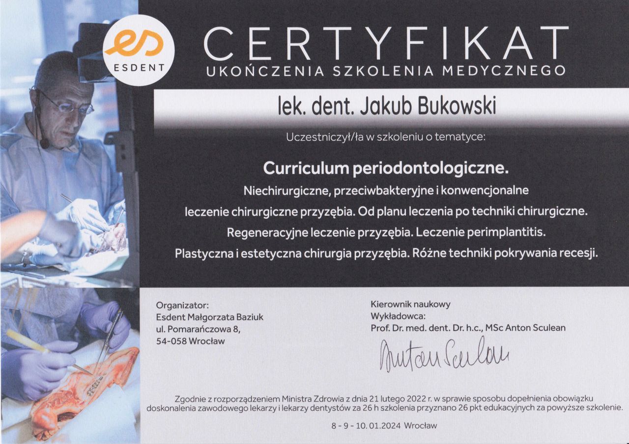 Jaki jest zakres porad oferowanych przez Jakub Bukowski?Jakub Bukowski to stomatolog, periodontolog. Na podstawie swojego doświadczenia i wykształcenia Jakub Bukowski oferuje usługi takie jak: Konsultacja periodontologiczna, Konsultacja periochirurgiczna, leczenie chorób błony śluzowej jamy ustnej, SRP (kiretaż), Konsultacja stomatologiczna.