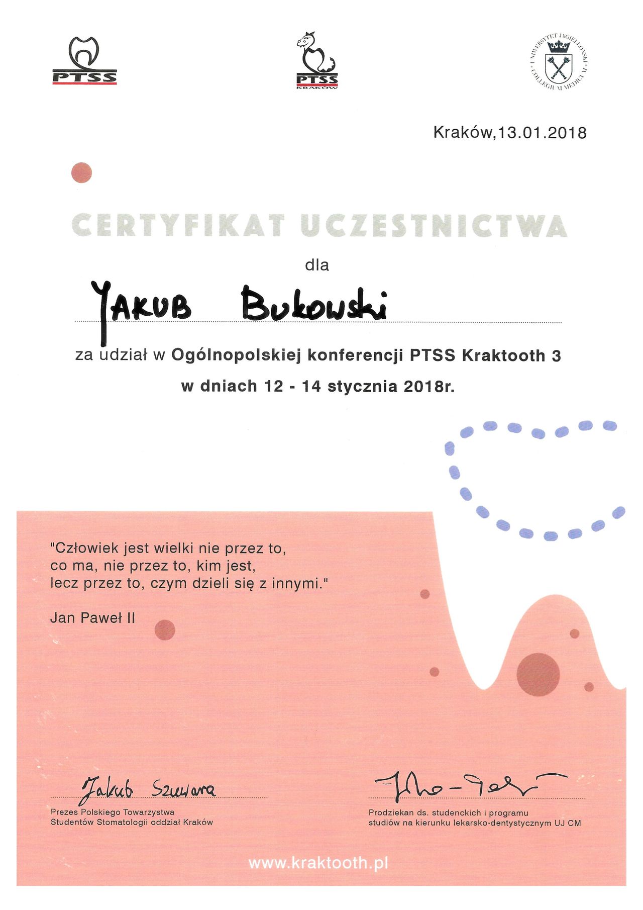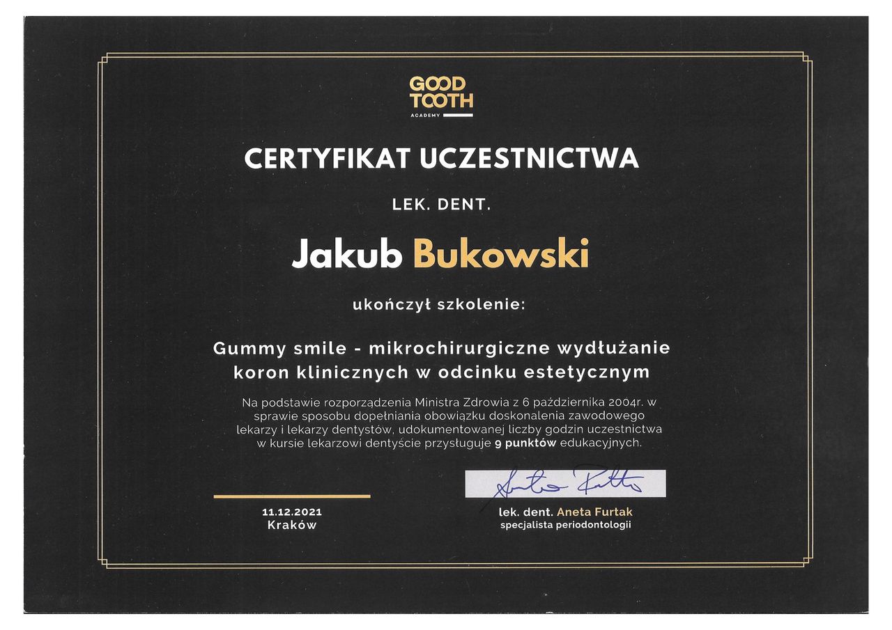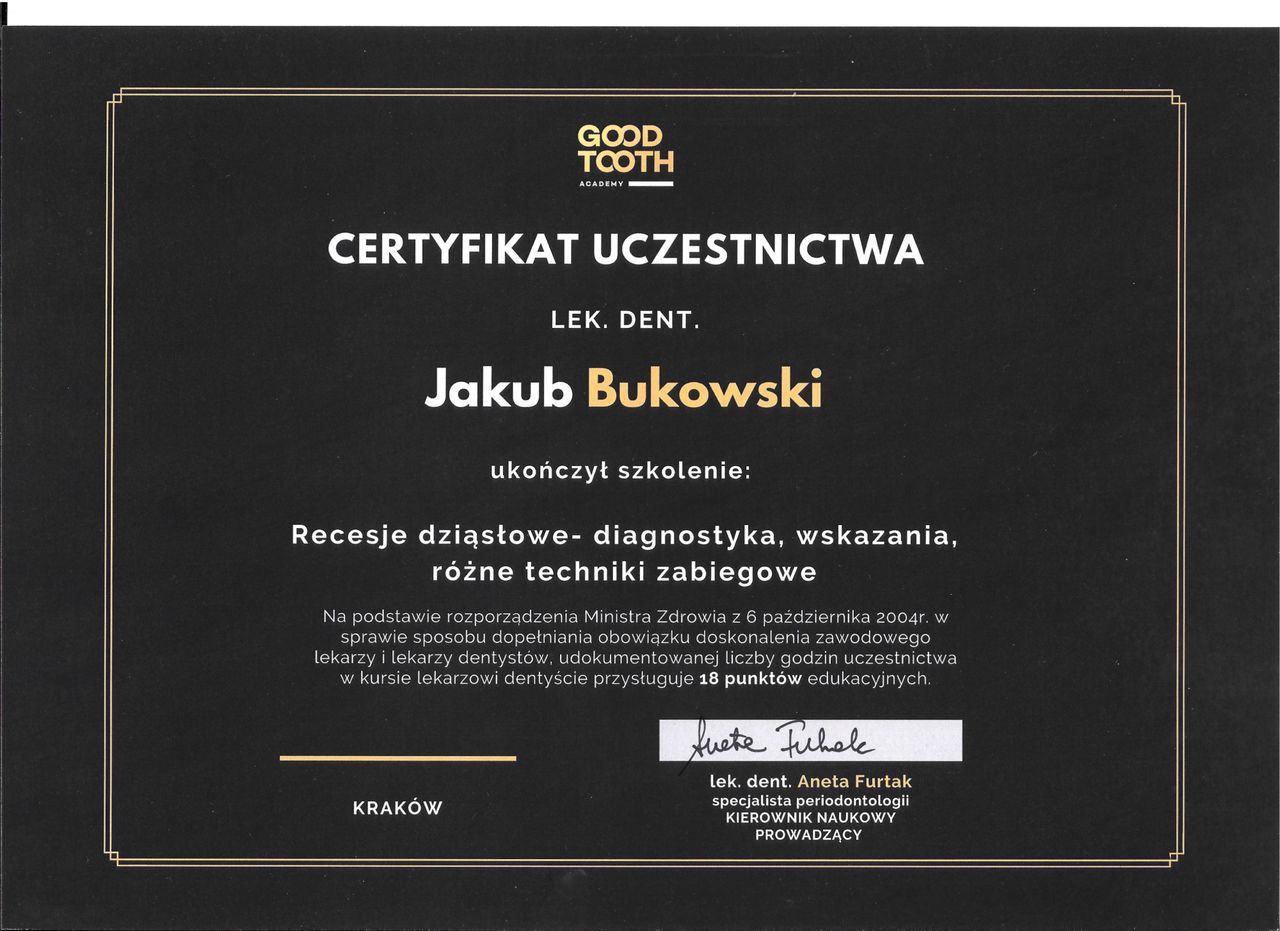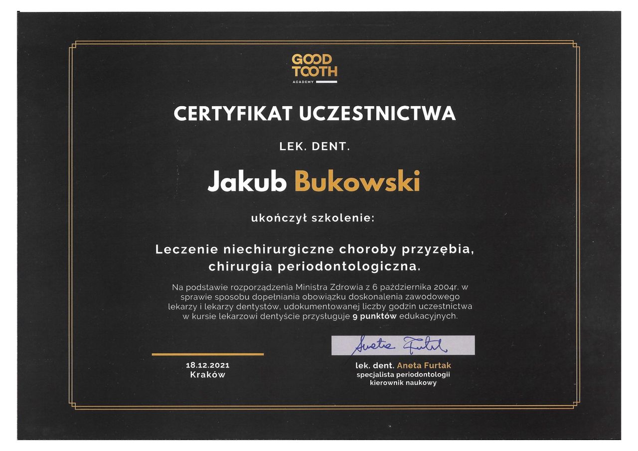 Jestem absolwentem kierunku lekarsko-dentystycznego Collegium Medicum Uniwersytetu Jagiellońskiego w Krakowie. Na UJ ukończyłem także szkolenie specjalizacyjne w dziedzinie periodontologii, czyli gałęzi stomatologii zajmującej się chorobami dziąseł, przyzębia i błony śluzowej jamy ustnej.