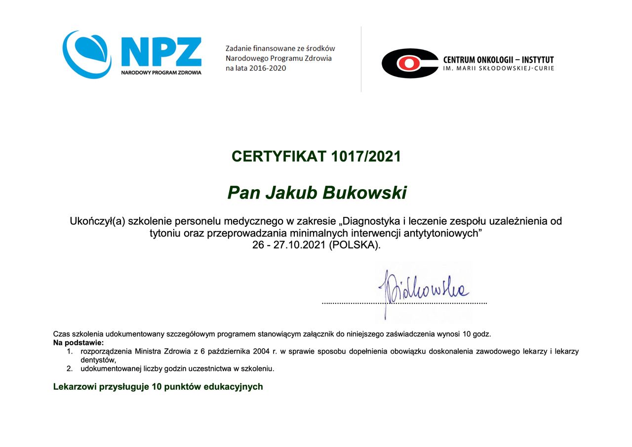 Czy Jakub Bukowski przyjmuje online, bez konieczności pojawiania się w placówce?Nie, w tym momencie Jakub Bukowski nie oferuje konsultacji online.