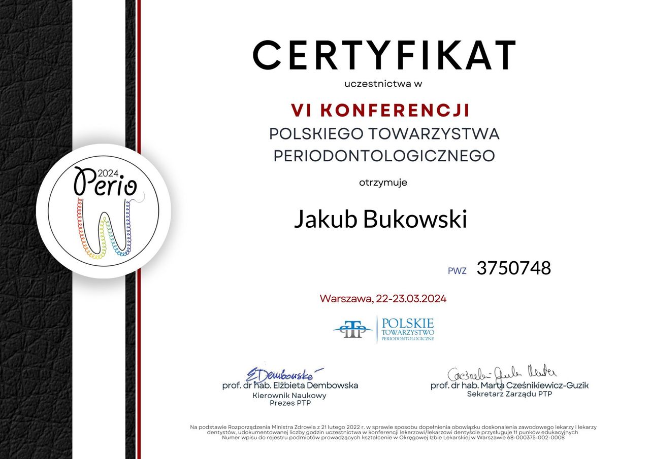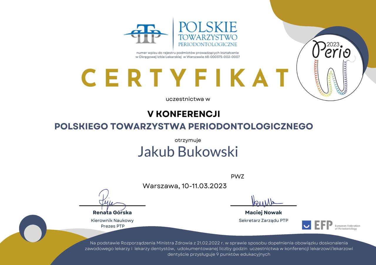 Nieustannie podnoszę swoje kwalifikacje poprzez uczestnictwo w krajowych i zagranicznych kursach z zakresu chorób przyzębia i błony śluzowej jamy ustnej. Jestem członkiem Polskiego Towarzystwa Periodontologicznego oraz Europejskiej Federacji Periodontologii (EFP).