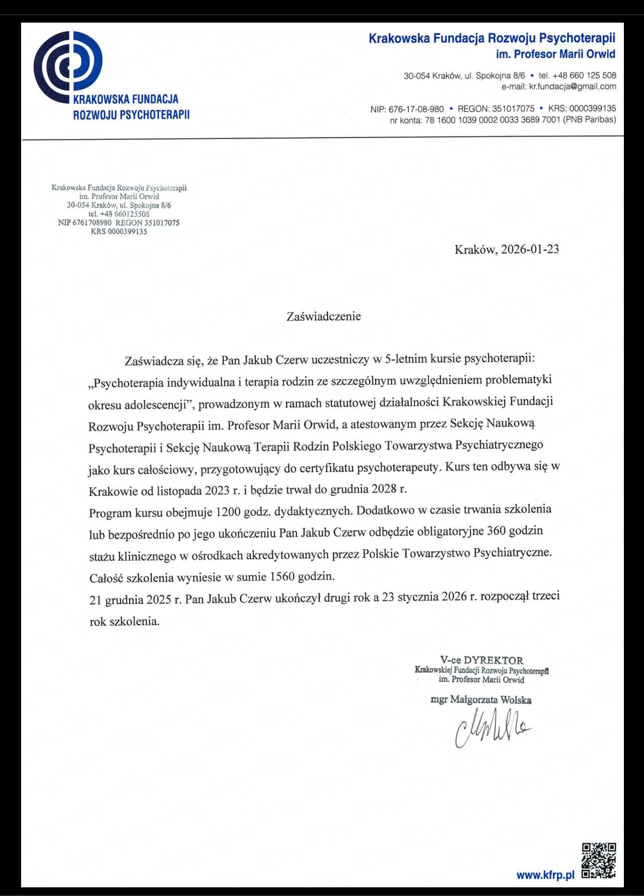 Jestem psychoterapeutą oraz pracownikiem naukowym. Obecnie uczestniczę w pięcioletnim, całościowym kursie psychoterapii akredytowanym przez Polskie Towarzystwo Psychiatryczne, organizowanym przez Krakowską Fundację Rozwoju Psychoterapii im. prof. Marii Orwid. Swoją wiedzę i kompetencje rozwijam również w Szkole Doktorskiej Nauk Społecznych Uniwersytetu Jagiellońskiego, gdzie przygotowuję rozprawę doktorską poświęconą leczeniu substytucyjnemu.