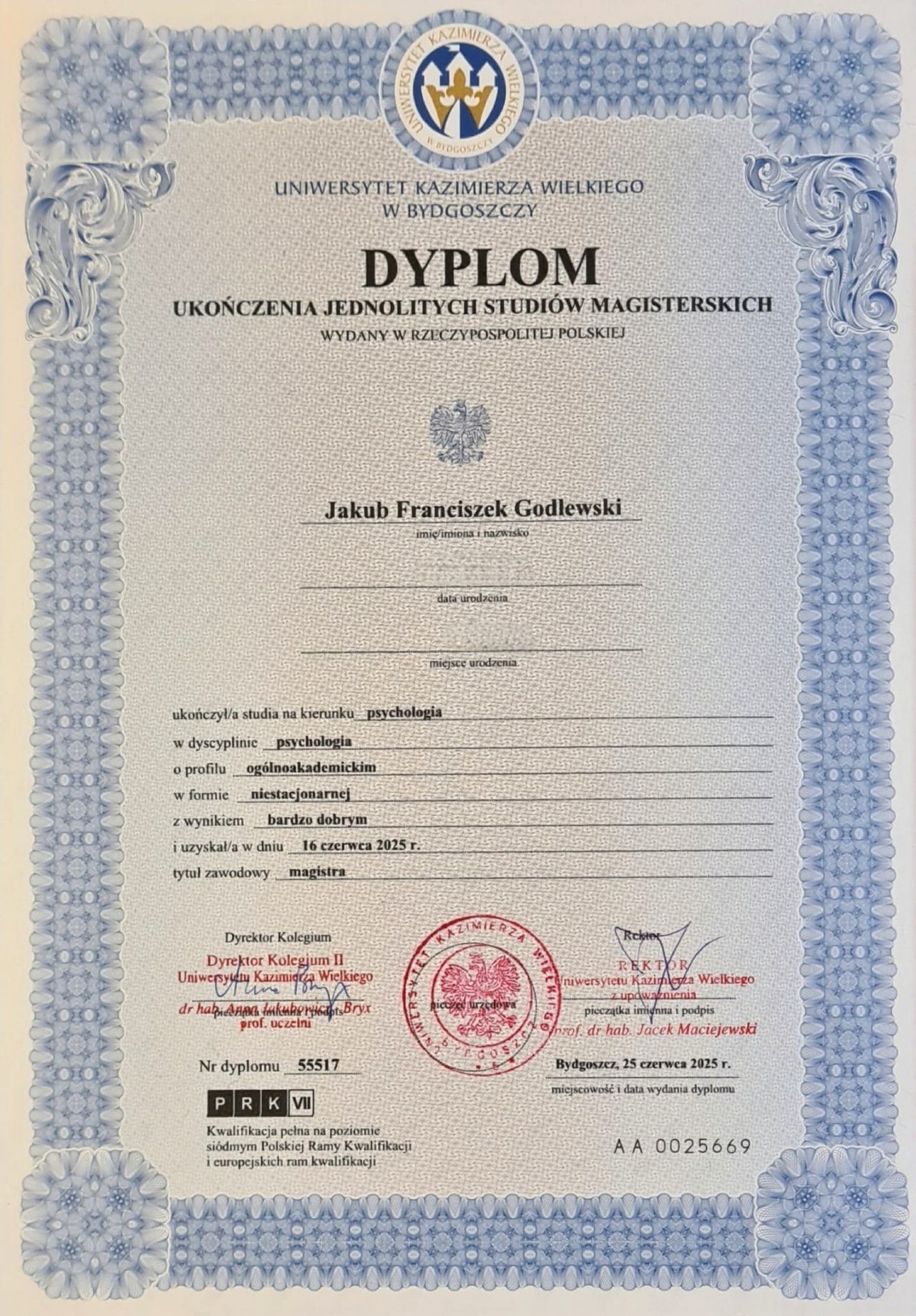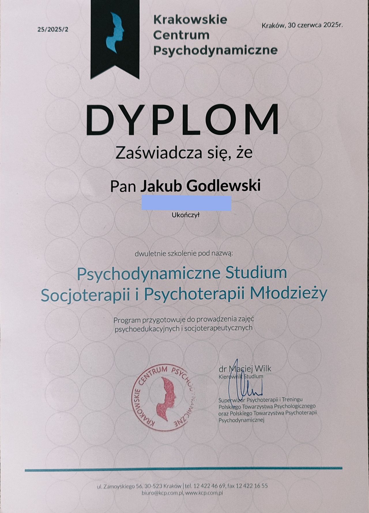 Jestem psychologiem, socjoterapeutą i psychoterapeutą w trakcie szkolenia w Krakowskim Centrum Psychodynamicznym. Ukończyłem studia na kierunku Psychologia na Uniwersytecie Kazimierza Wielkiego w Bydgoszczy i specjalności klinicznej.