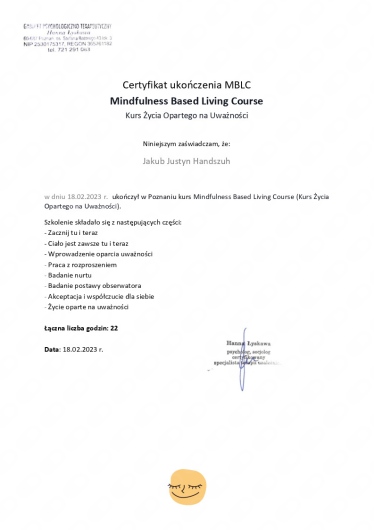 Spotkania w bardzo miłej atmosferze. Pan Jakub jest bardzo empatycznym i zaangażowanym specjalistą. Dzięki jego narzędziom dotyczącym mindfulness potrafię się uspokoić i skupić na aktualnie przeżywanych uczuciach.