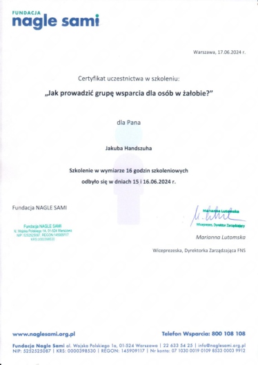 Pan Jakub przeprowadził ze mną serię spotkań w wyniku których poczułam się znacznie lepiej. Pan Jakub sprawił że czułam się bezpiecznie i zaopiekowana. Jest profesjonalny, cierpliwy, życzliwy i miły. W razie potrzeby, kontynuowałabym współpracę z nim.