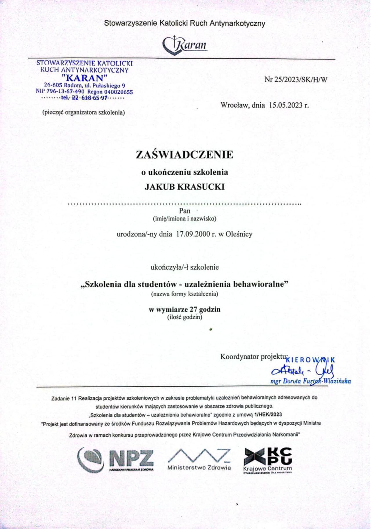 Jaki jest zakres porad oferowanych przez Jakub Krasucki?Jakub Krasucki to psycholog. Na podstawie swojego doświadczenia i wykształcenia Jakub Krasucki oferuje usługi takie jak: Konsultacja psychologiczna, Konsultacja psychologiczna dla par, Diagnoza osobowości NEO-PI-R.