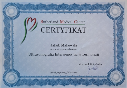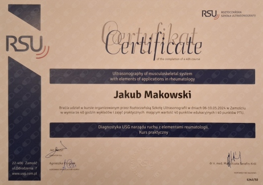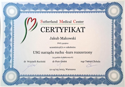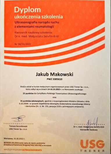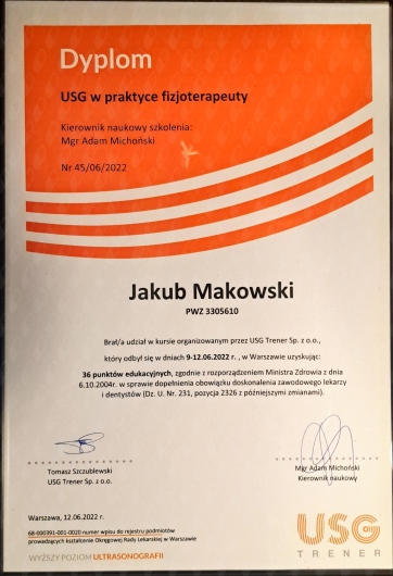 Diagnoza doktora Jakuba Makowskiego okazała się w 100% trafna. Zostałem skierowany na operację ortopedyczną. Lekarz chirurg, po operacji, powiedział mi, że "Makowski bezbłędnie trafił z oceną sytuacji". Wszystko na co wskazywał doktor Makowski podczas badania i USG, potwierdzono po rozcięciu mojego ciała. Doktor Makowski bardzo dokładnie wykonał swoją pracę, szczegółowo zbadał co trzeba i opisał. Po prostu jest dobrym fachowcem. Szczerze polecam.