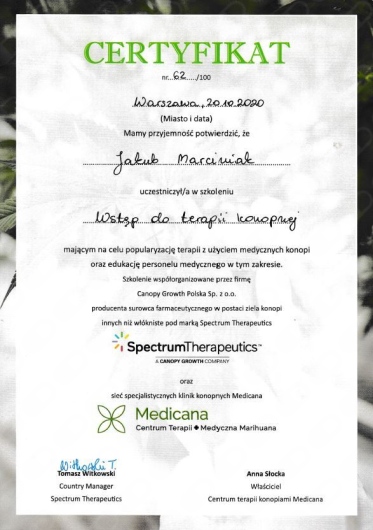 Jaki jest zakres porad oferowanych przez Jakub Marciniak?Jakub Marciniak to ortopeda. Na podstawie swojego doświadczenia i wykształcenia Jakub Marciniak oferuje usługi takie jak: Iniekcja z osocza bogatopłytkowego – PRP, konsultacja ortopedyczna + USG, Leczenie marihuaną medyczną (leczenie bólu), blokady dostawowe, iniekcja dostawowa kwasu hialuronowego Chondrovital Gel, iniekcja kwasu hialuronowego (Biolevox lub Chondrovital), iniekcja dostawowa, konsultacja ortopedyczna, Blokada przykręgosłupowa, konsultacja ortopedyczna + iniekcja dostawowa.
