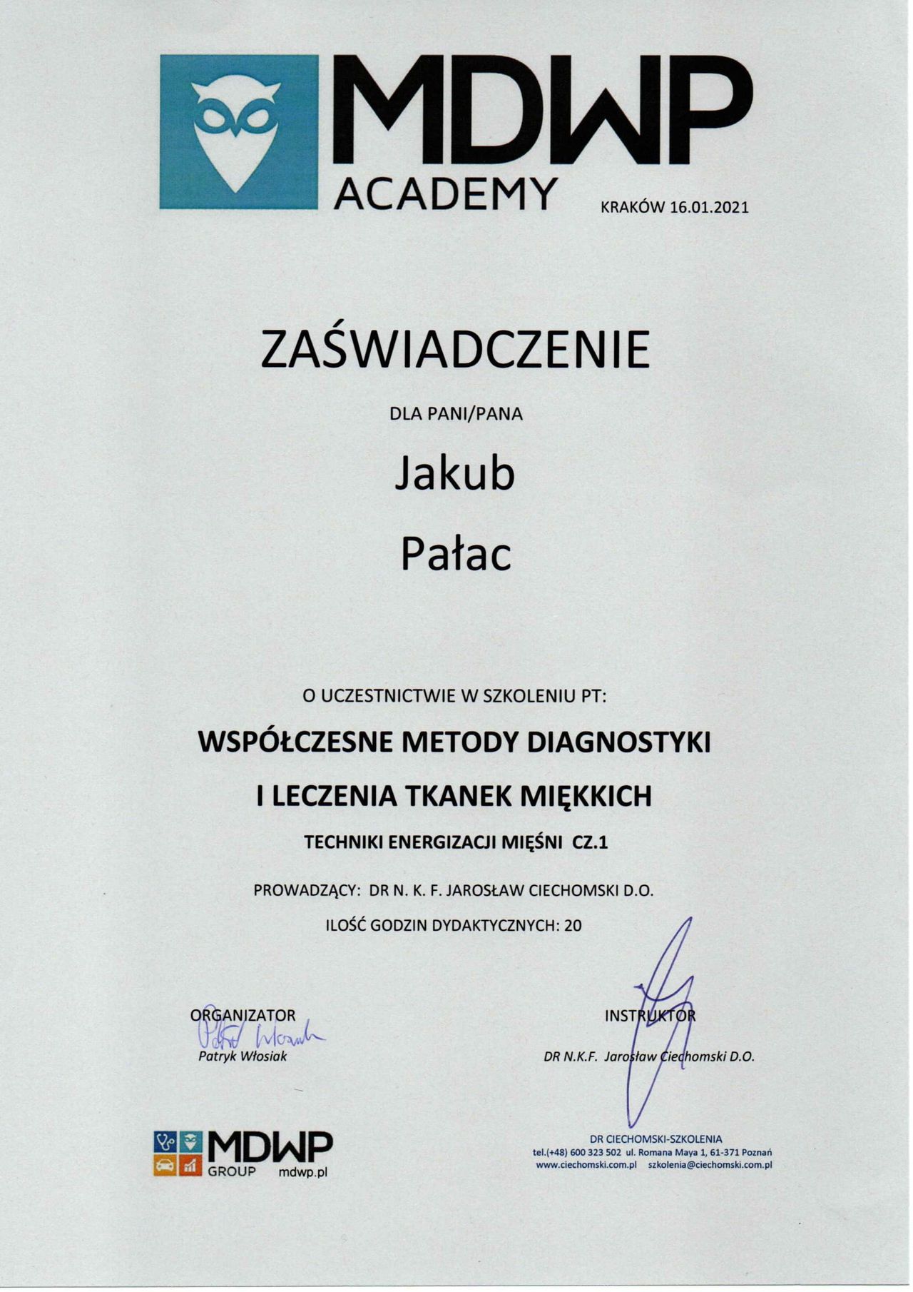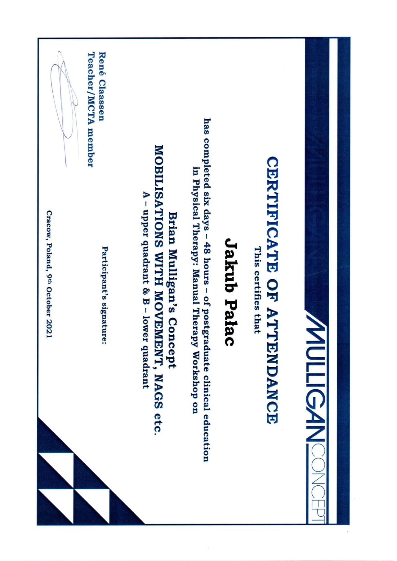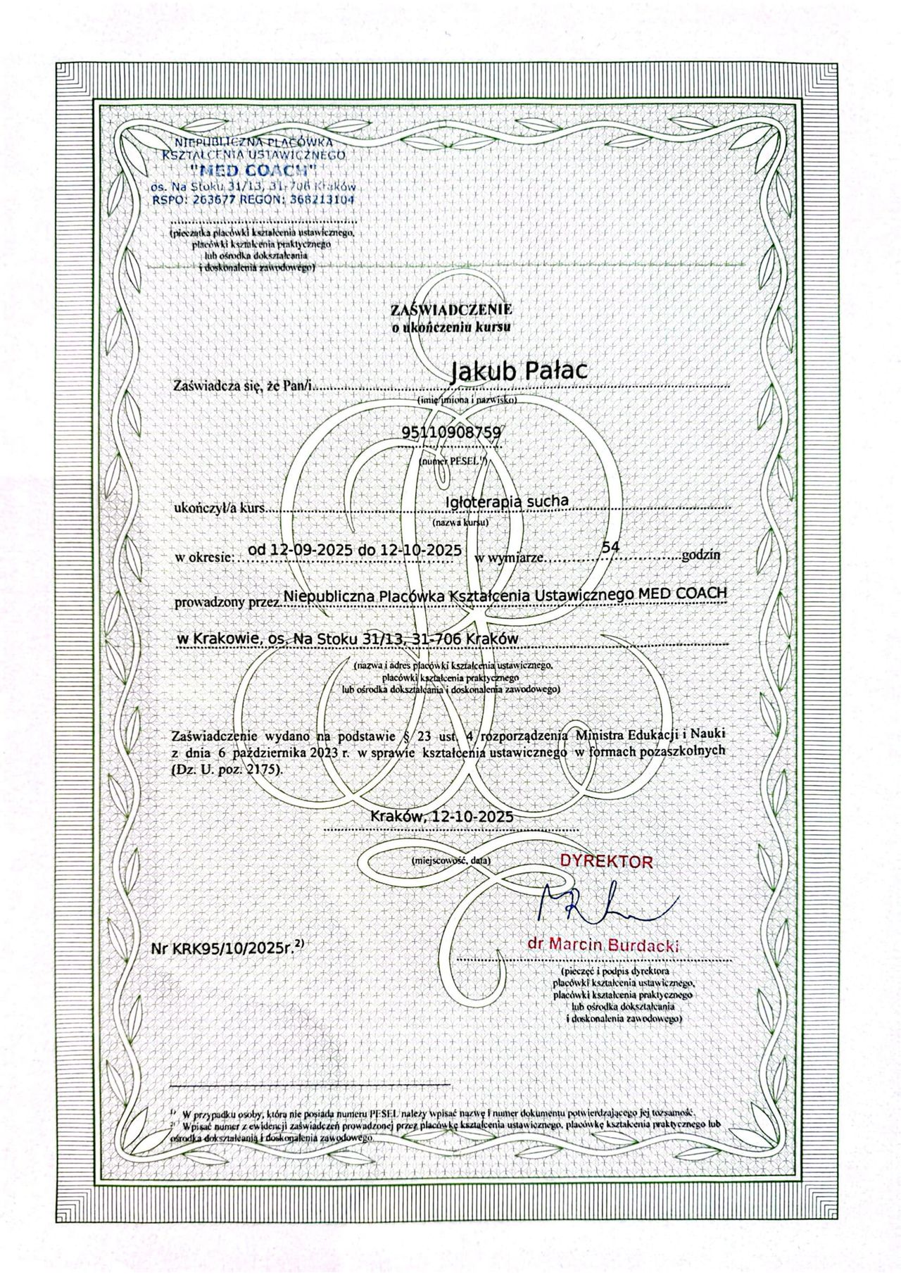 Posiadam wieloletnie doświadczenie oraz ukończyłem liczne kursy specjalistyczne z zakresu terapii manualnej, terapii mięśniowo-powięziowej oraz nowoczesnych metod leczenia bólu i ograniczeń ruchomości.