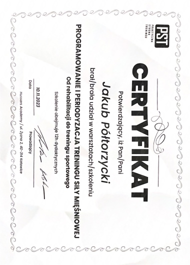 Jaki jest zakres porad oferowanych przez Jakub Półtorzycki?Jakub Półtorzycki to fizjoterapeuta. Na podstawie swojego doświadczenia i wykształcenia Jakub Półtorzycki oferuje usługi takie jak: Terapia manualna, konsultacja fizjoterapeutyczna (pierwsza wizyta), konsultacja fizjoterapeutyczna, konsultacja fizjoterapeuty - rehabilitacja manualna (pierwsza wizyta), konsultacja fizjoterapeuty - rehabilitacja manualna (kolejna wizyta), medyczny trening rehabilitacyjny.
