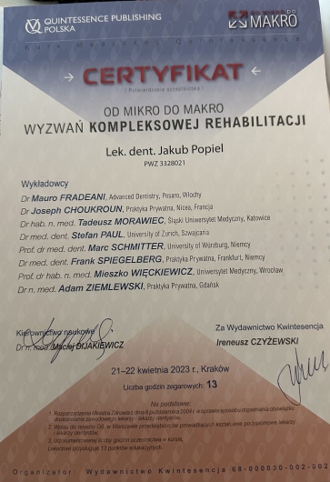 Przez prawie 10 lat mojej pracy klinicznej oraz dydaktycznej, byłem uczestnikiem najważniejszych konferencji oraz kursów stomatologicznych w całej Polsce oraz Europie, aby zapewnić pacjentom najwyższą jakość świadczonej pomocy dentystycznej. Pracuję zawsze w lupach powiększających aby zadbać o każdy szczegół uśmiechu. Szczególny nacisk kładę na minimalnie inwazyjne techniki leczenia, pozwalające zachować jak najwięcej tkanek własnych zęba.